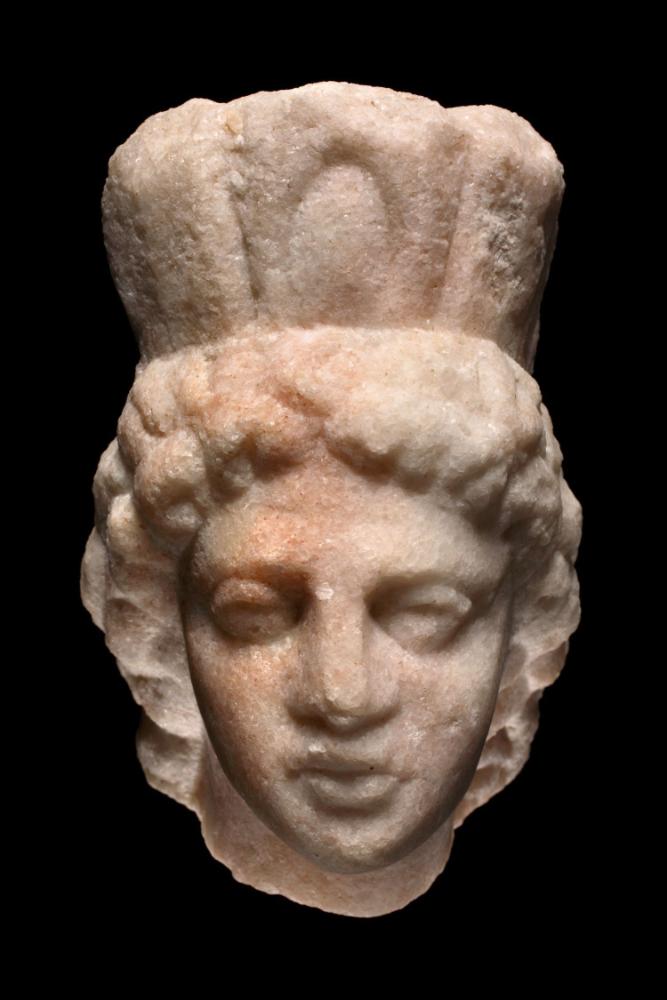Das etwas schräg zur rechten Schulter geneigte Köpfchen hat volle Lippen und mandelförmige Augen mit dicken oberen Lidern. Die Augäpfel sind nach oben abgeschrägt. Das schulterlange Haar bedeckt in dicken Lockenbüscheln die Ohren. Die leicht nach oben ausgestellter Mauerkrone zeigt senkrechte Unterteilungen und in der Mitte eine ovale Einkerbung (Torbogen?).