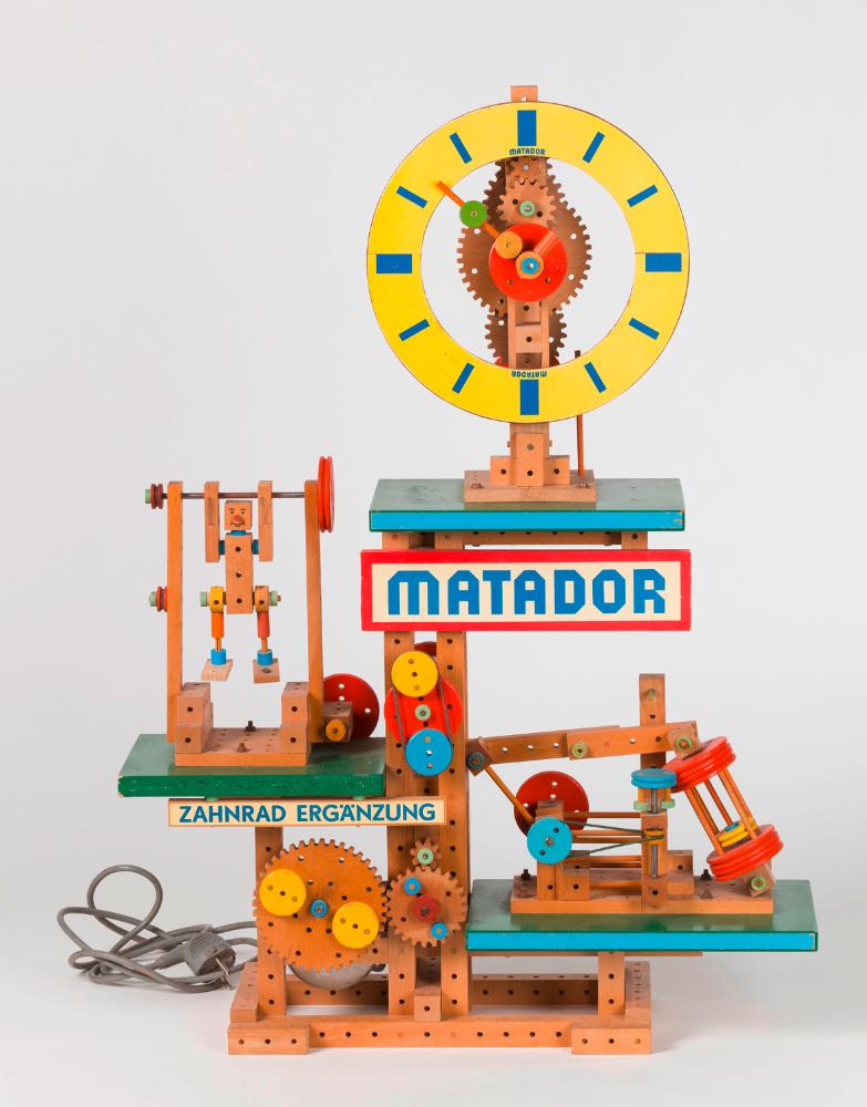 Matador Schaufenster Demonstrationsmodell, dekoratives, motorbetriebenes Werbe-Schaufenstermodell aus Bauteilen der Matador Holzbaukästen für den Spielzeugfachhandel, Fa. Matador, Ing. Johann Julius Korbuly, Made in Austria