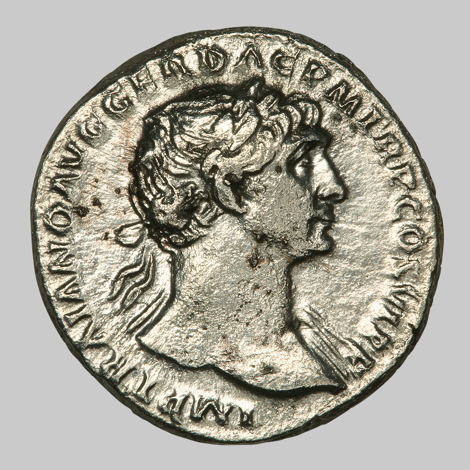 Avers: IMP(eratori) TRAIANO AVG(usto) GER(manico) DAC(ico) P(ontifici) M(aximo) TR(ibunicia) P(otestate) CO(n)S(uli) VI P(atri) P(atriae)
