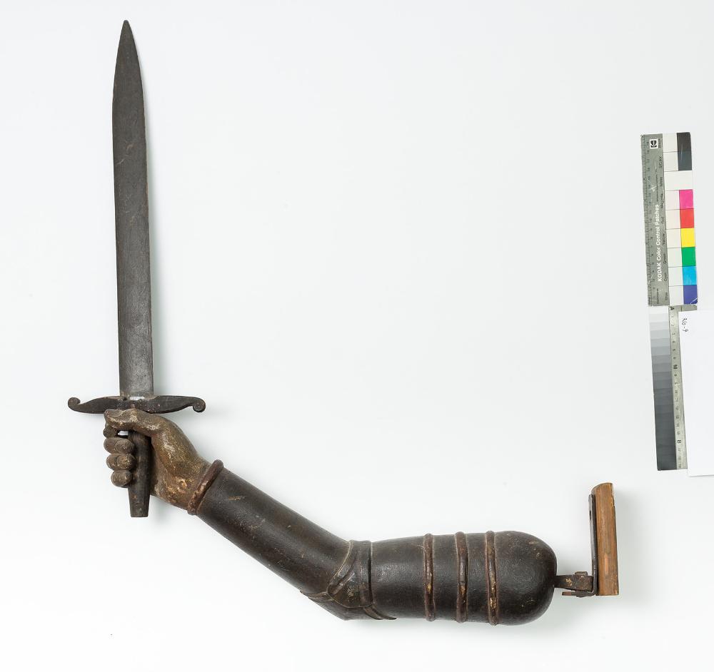 Arm mit Schwert, aus Holz geschnitzt. Klinge später ergänzt; Arm mit einer Rüstung bekleidet.