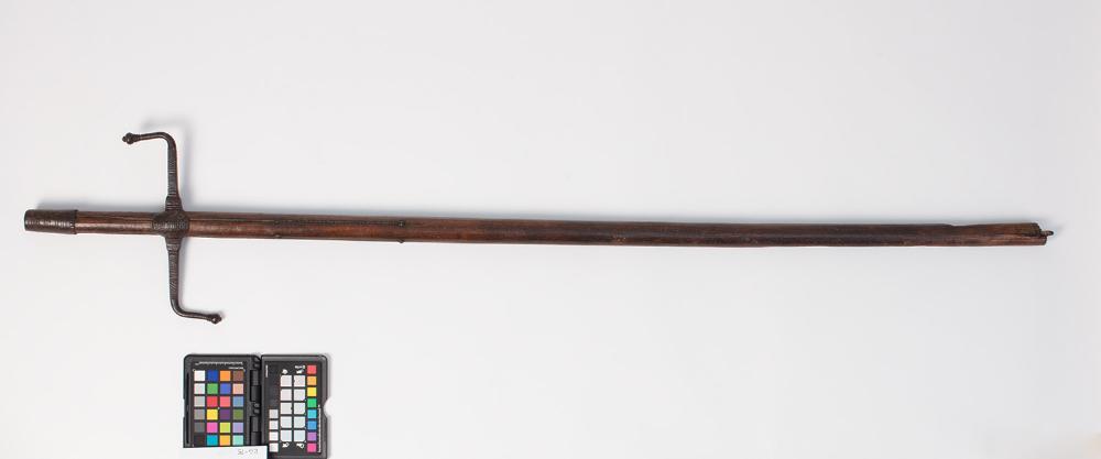 S-förmige Parierstange, mit einfacher Linienornamentierung und eiserner Knauf.