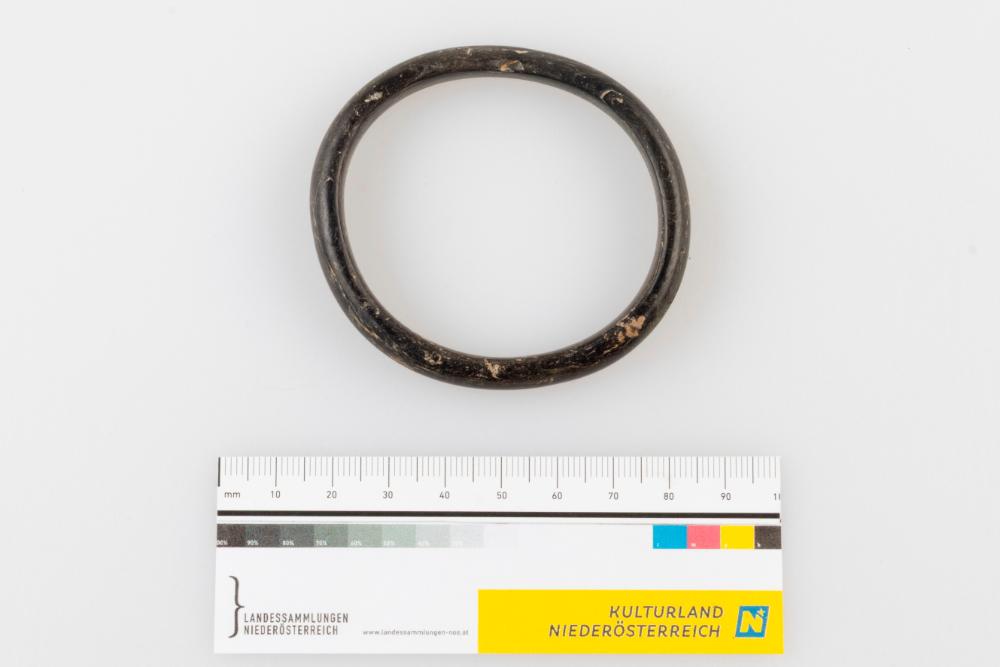 Der ovale Sapropelit-Armreif zeichnet sich durch einen D-förmigen Querschnitt aus. Hinsichtlich der Farbgebung ist eine bräunlich-schwarze Pigmentierung zu erkennen. Der Begriff Sapropelit bezeichnet eine Kohlesorte, die sich im Lauf von Jahrmillionen aus Faulschlamm gebildet hat. Die Bearbeitung dieses Materials erfolgt in ähnlicher Weise wie die von Holz.