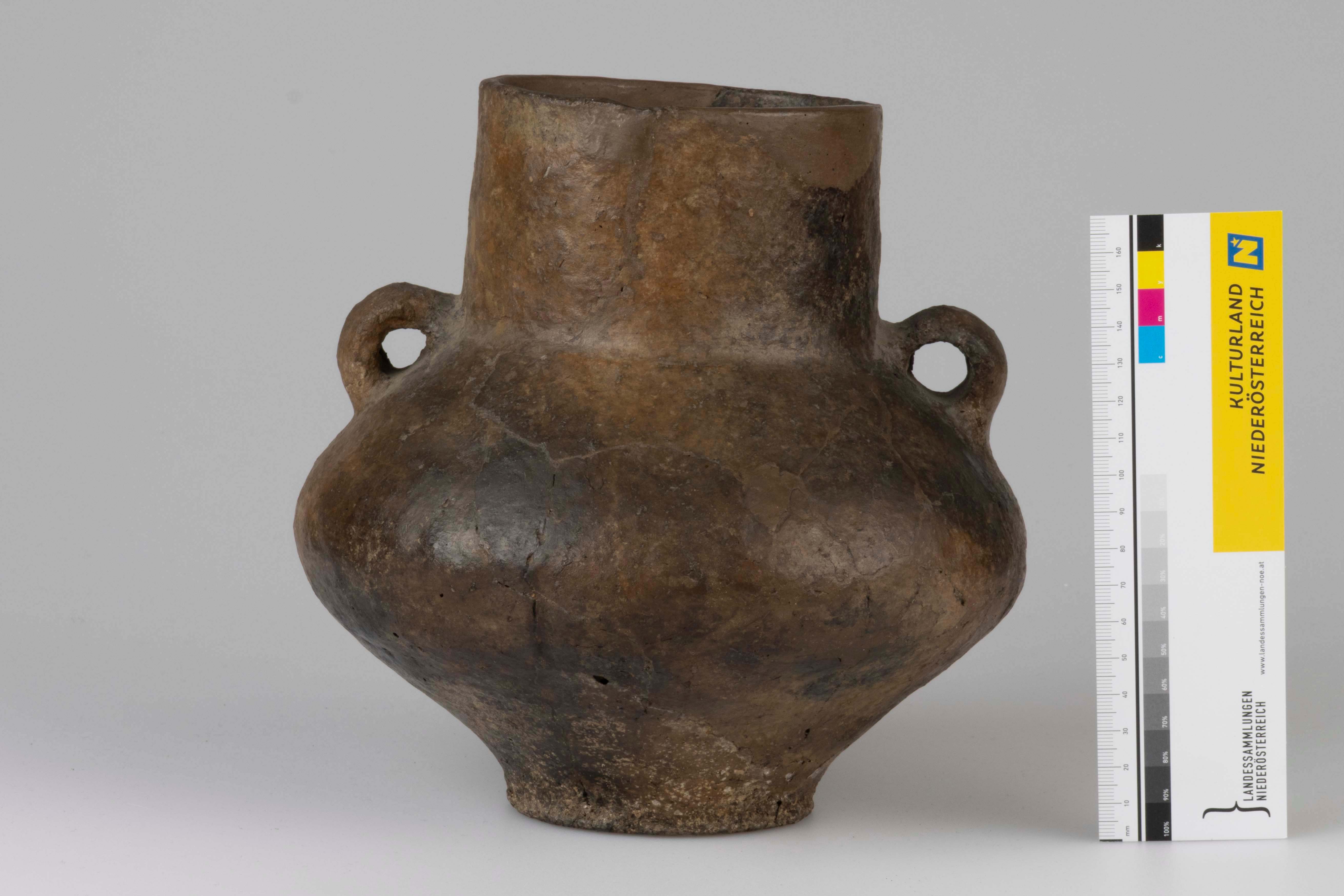 Zylinderhalsgefäß ohne Verzierung. Das Objekt weist einen gerade abschließenden Rand auf, zudem ist es im Bereich des Schulterumbruchs mit zwei einander gegenüberliegenden Bandhenkeln versehen. Die Gefäßoberfläche ist poliert.