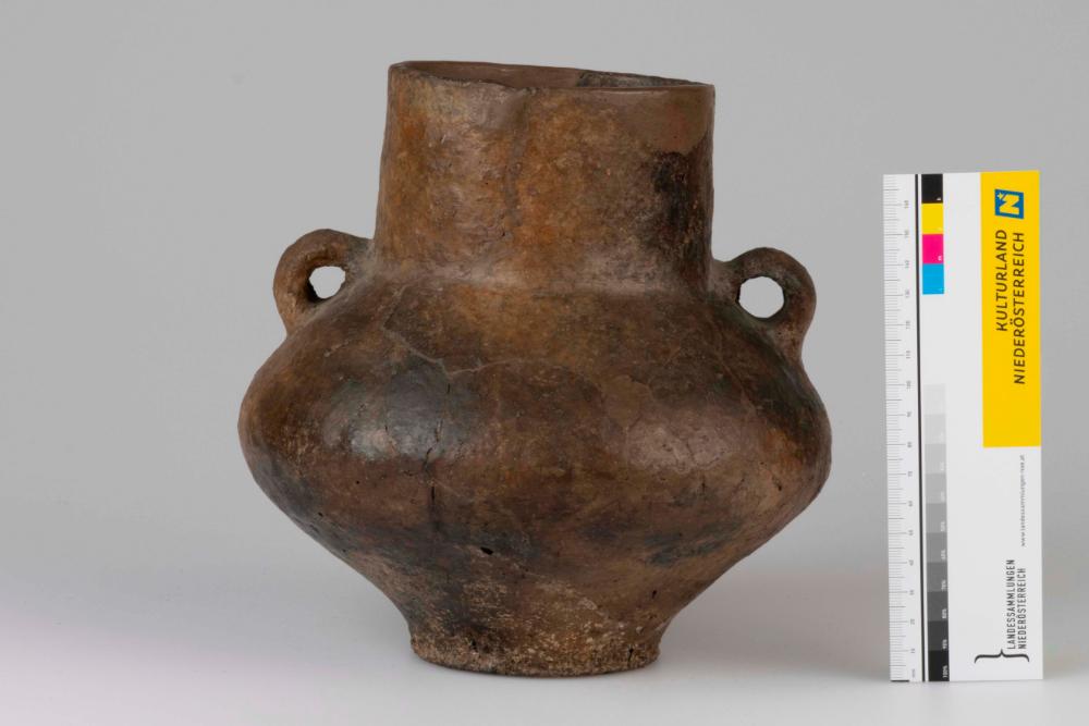 Zylinderhalsgefäß ohne Verzierung. Das Objekt weist einen gerade abschließenden Rand auf, zudem ist es im Bereich des Schulterumbruchs mit zwei einander gegenüberliegenden Bandhenkeln versehen. Die Gefäßoberfläche ist poliert.