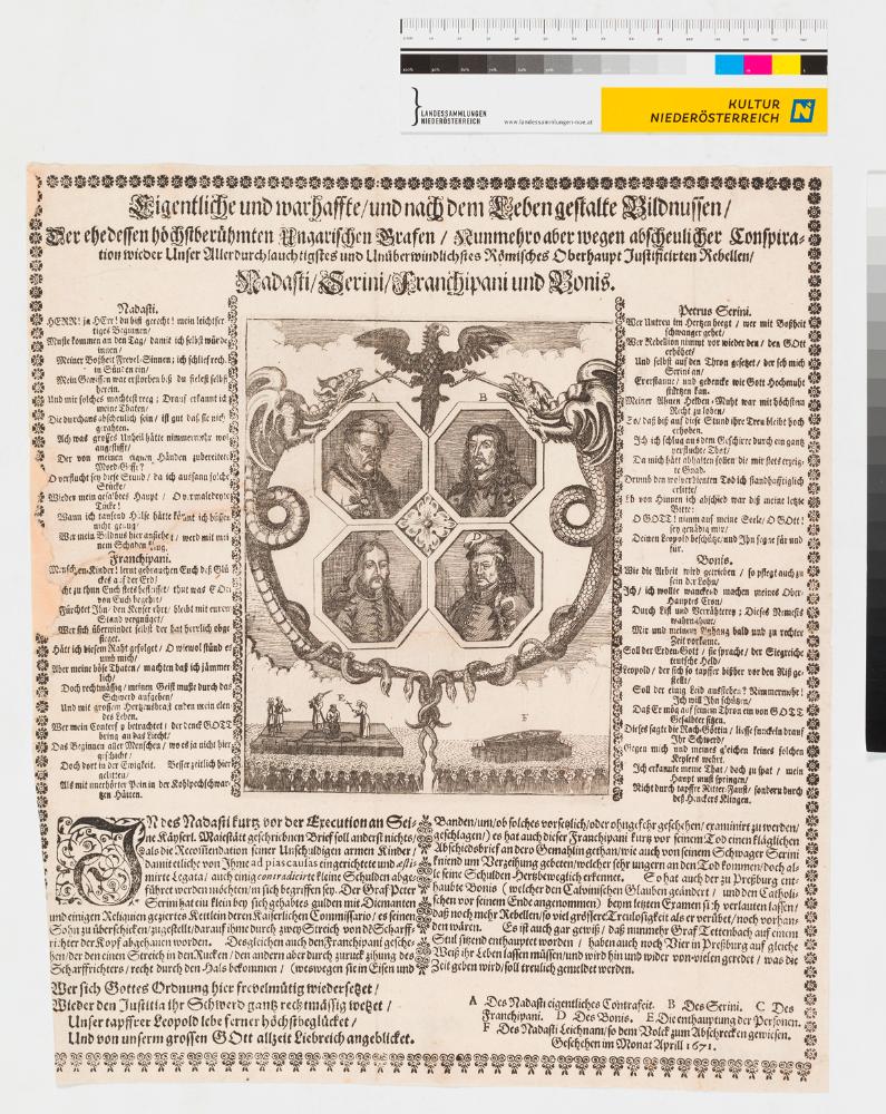 Eigentliche und warhaffte und nach dem Leben gestalte Bildnissen Der ehedessen höchstberühmten ungarischen Grafen, nunmehrs aber wegen abscheulicher Conspiration ... Justifizierten Rebellen Nádasti, Zerini, Franchipani und Bonis.