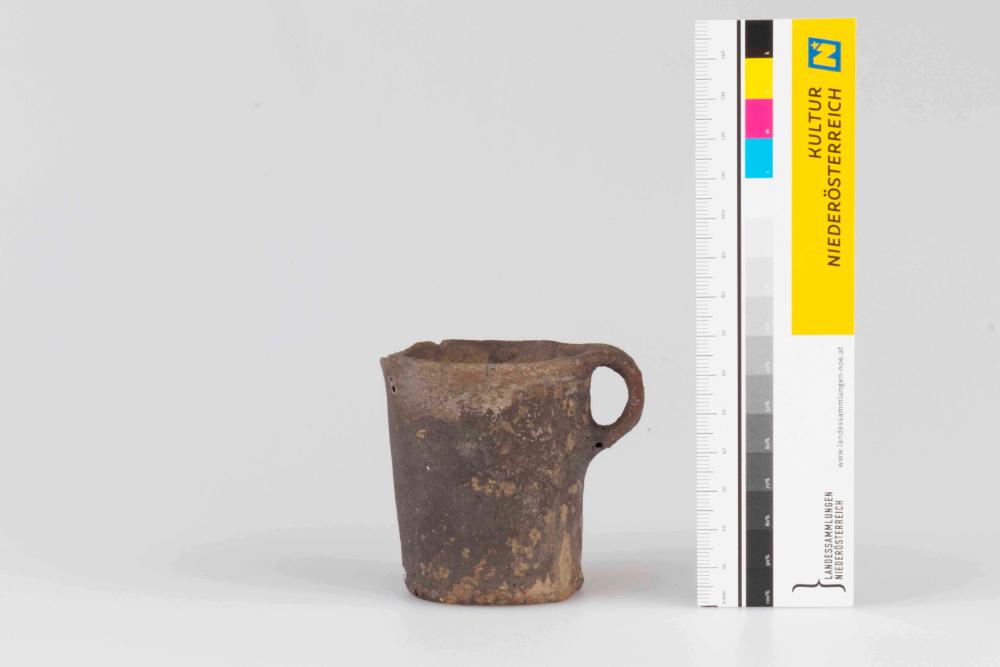 Der zylindrische, vollständig erhaltene Becher wurde als Hohlmaßbecher interpretiert. Der Boden des Bechers ist flach und verfügt über einen schmalen randständigen Bandhenkel. Das Gefäß aus sandigem Ton weist eine matte Oberfläche auf, auf der stellenweise ein hellbrauner, dünner Schlicker zu erkennen ist.