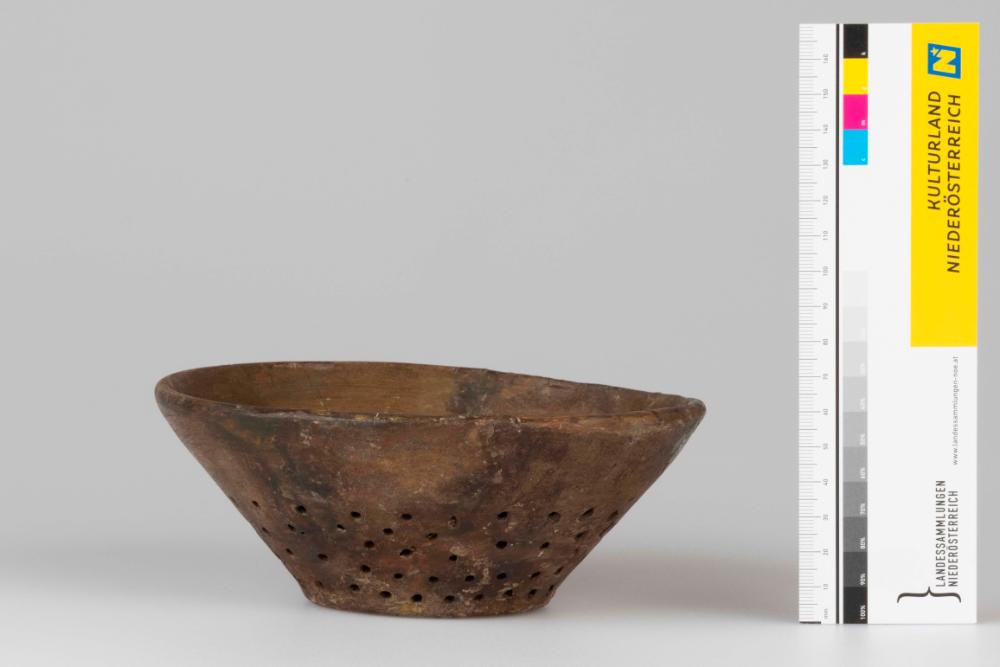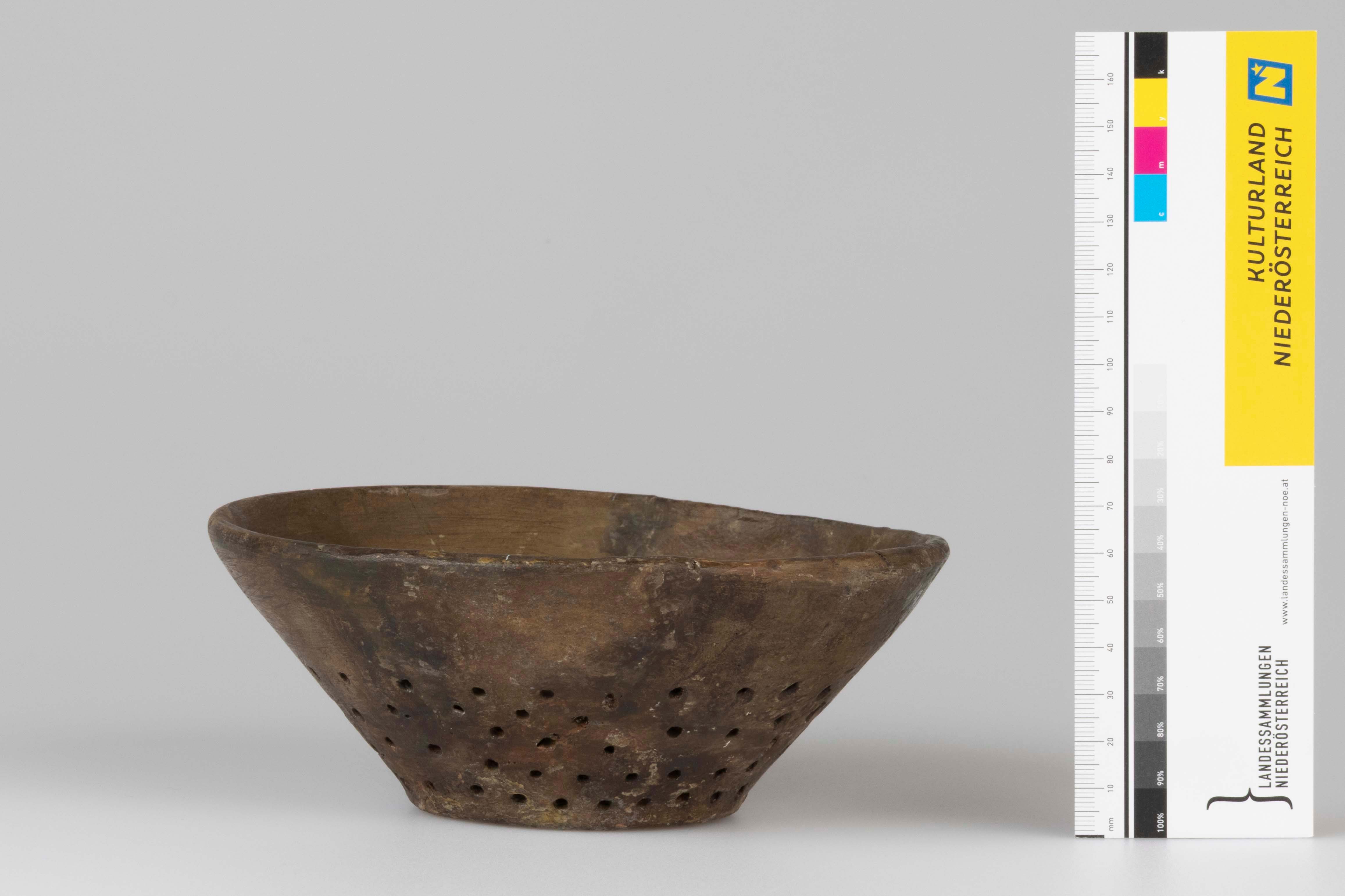 Ein schüsselförmiges Tonsieb aus gut gebranntem, braunem Ton. Das Gefäß ist unverziert, jedoch mit runden Löchern besetzt. Die unregelmäßige Durchlochung beginnt 3 cm vom Rand der Öffnung entfernt. Gegen den Boden nimmt sie an Dichte zu.