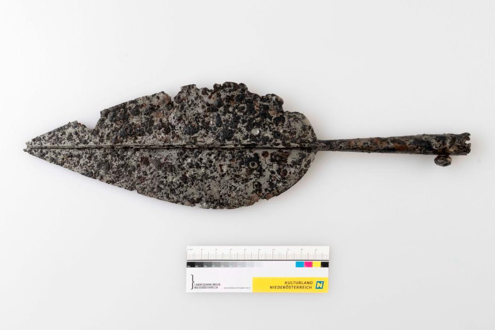 Die breite Lanzenspitze ähnelt in ihrer Form einem Lorbeerblatt und endet in einer konisch erweiterten Tülle. Das darüberliegende Blatt zeichnet sich durch eine signifikant breite Form aus. Das Objekt weist einen signifikant ausgeprägten Mittelgrat auf.