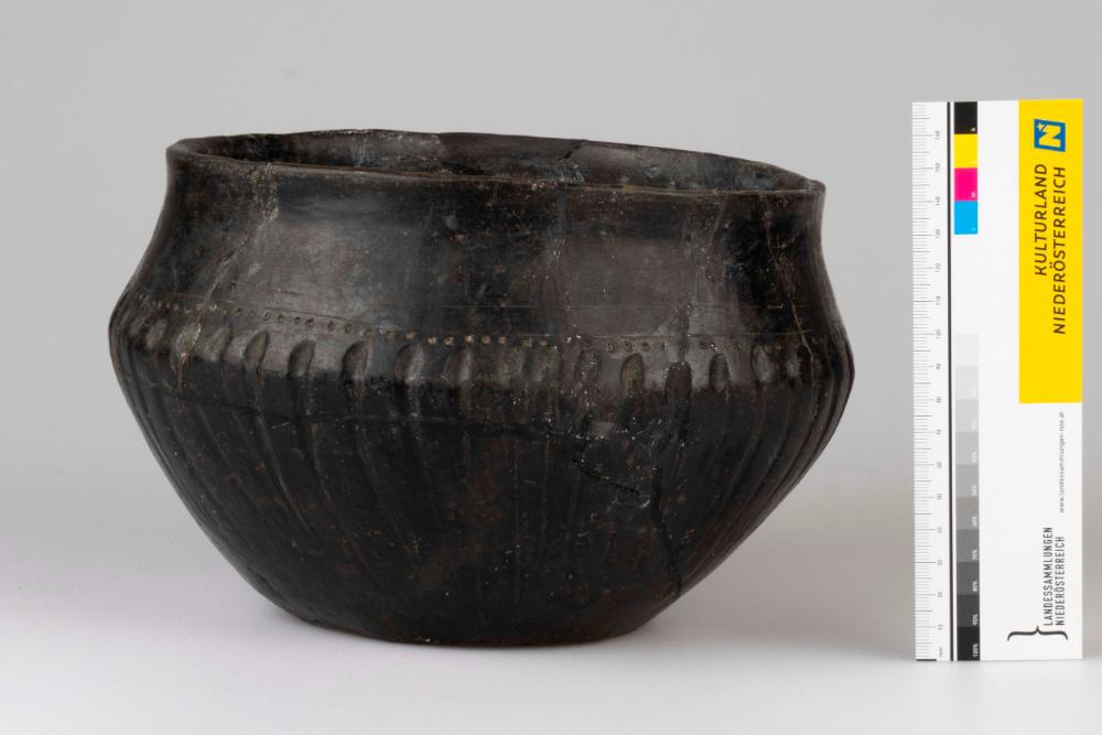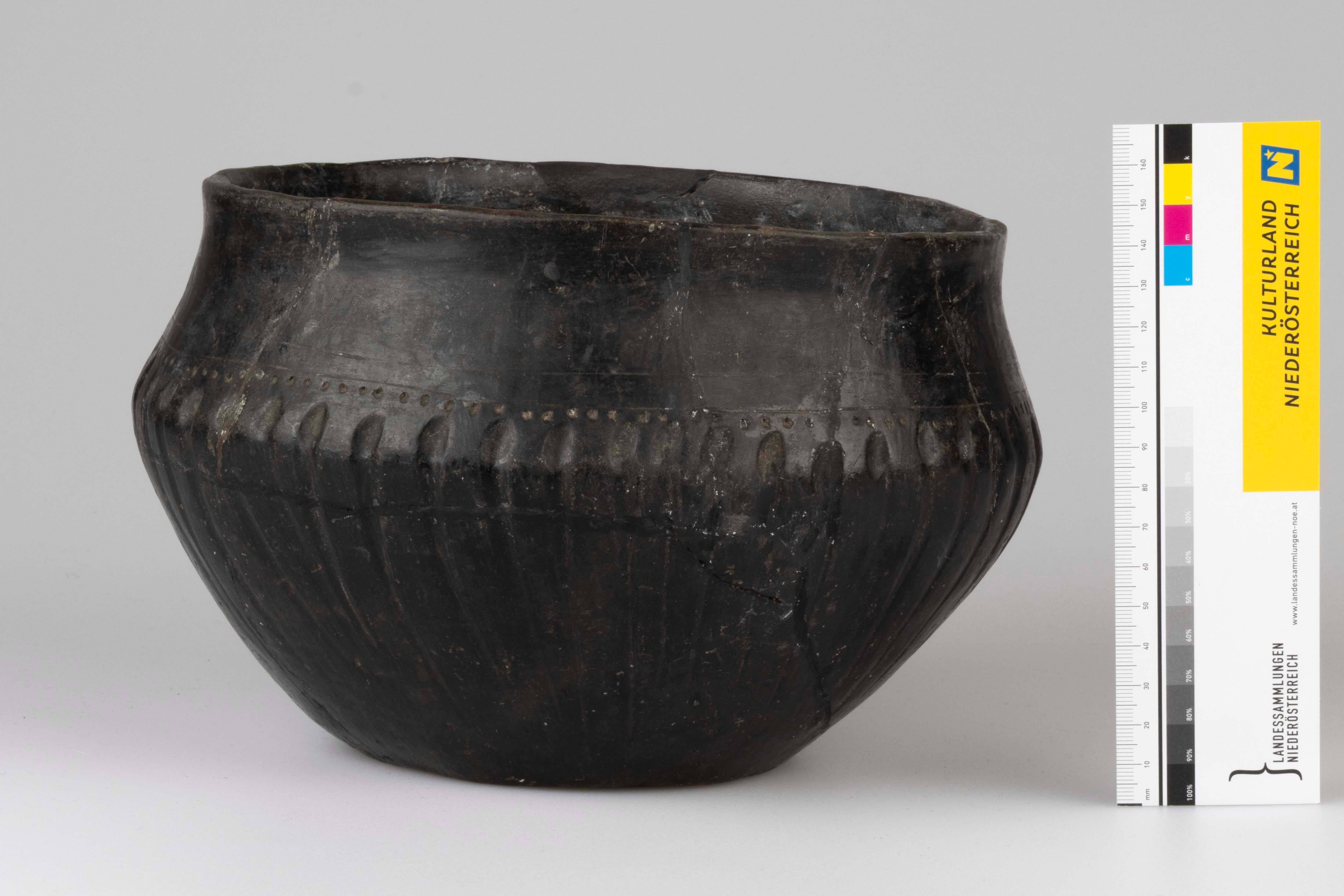 Ein weitmündiges, bauchiges Gefäß, mit feiner, polierter Oberfläche. Es wurde aus grobem, dunkelbraun gebranntem Ton gefertigt. Der Hals weist eine minimale Wölbung auf, während der Rand eine leichte Ausbiegung aufzeigt. Auf der Schulterpartie befinden sich zwei parallele, horizontal verlaufende Ritzlinien, unter denen sich runde Vertiefungen befinden. Darunter verlaufen die Furchen in vertikaler Richtung und erstrecken sich bis in die unteren Bereiche des Bauches.
