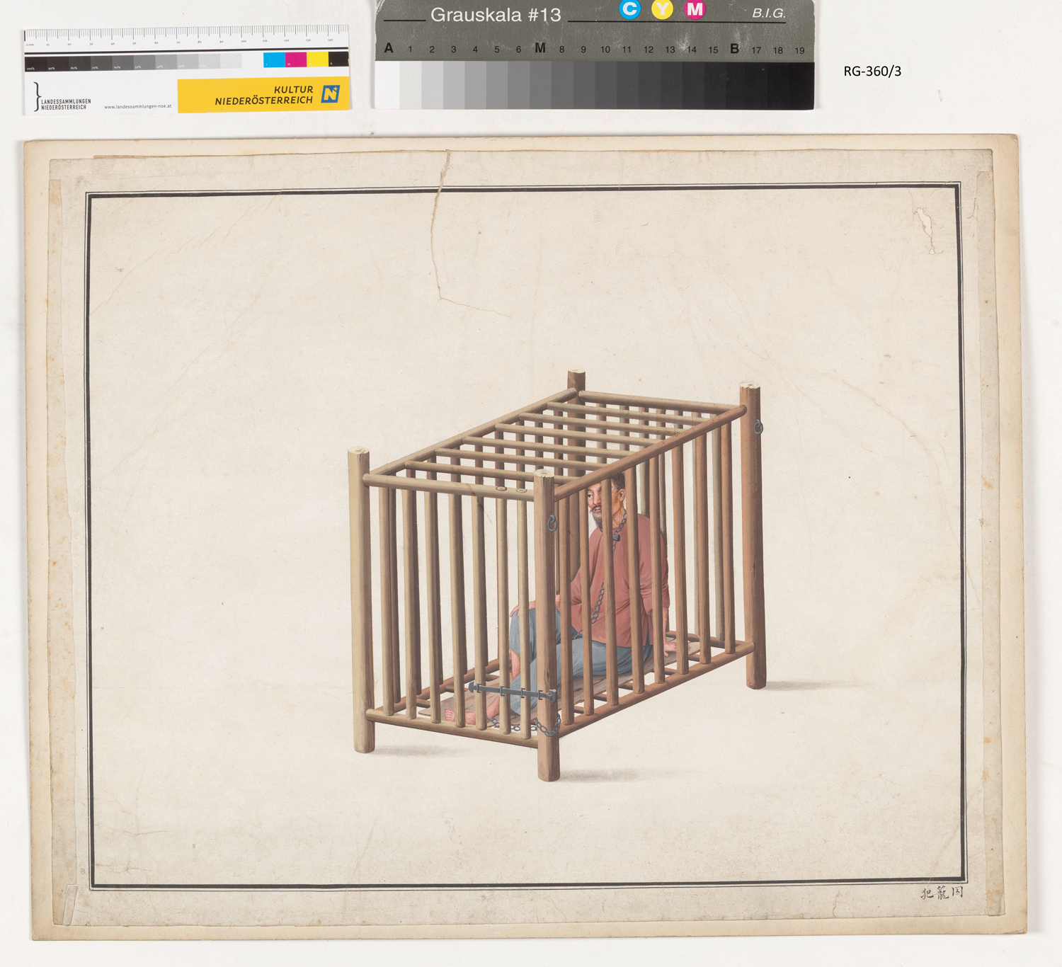 Bestrafung im Holzkäfig; aus "Serie chinesischer Folterszenen"