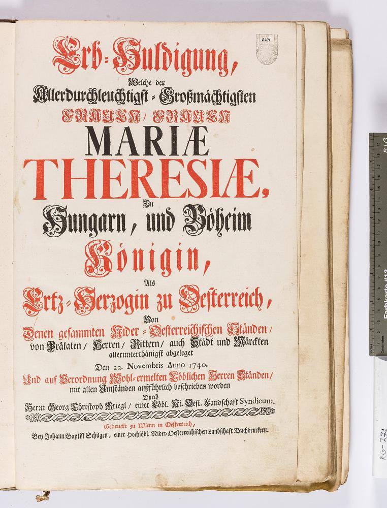 Erb-Huldigung, Welche der Allerdurchleuchtigst-Großmächtigsten Frauen / Frauen Mariae Theresiae, Zu Hungarn, und Böheim Königin, Als Ertz-Herzogin zu Oesterreich, Von denen gesammten Nider-Oesterreichischen Ständen [etc.] abgelegt Den 22. Novembris Anno 1740.