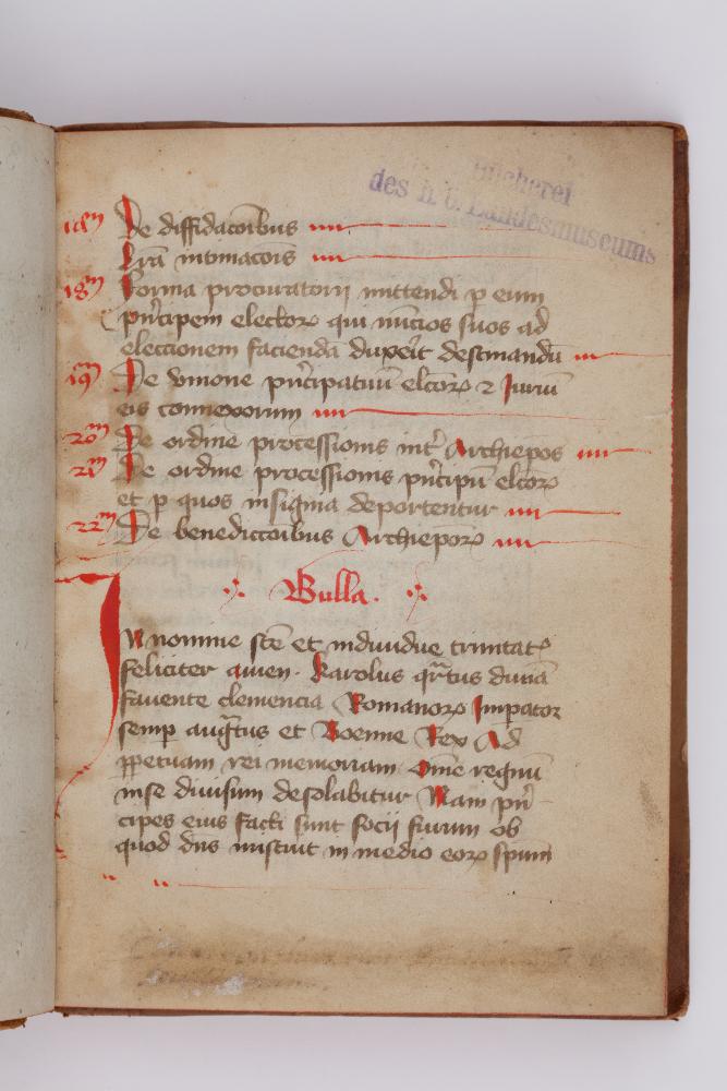 Frühe Abschrift der Goldenen Bulle Kaiser Karls IV. Rot rubriziert, späterer Halblederband. Frühe Niederschrift dieses berühmten Gesetzes.