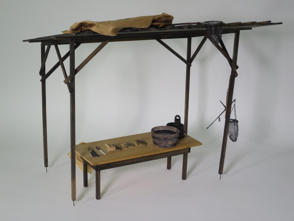 Marktstand, bestehend aus Verkaufstisch und Überdachung. Auf dem Tisch zwei Holzbottiche gefüllt mit Wasser, daneben fünf Fische, ein Holzhammer, ein Messer und ein Schlachterbeil sowie an die Zarge genageltes Packpapier. Am rechten vorderen Pfosten hängt eine Balkenwaage. die Überdachung bildet ein hölzernes Pultdach, darauf ein Leintuch sowie ein Fischköcher.