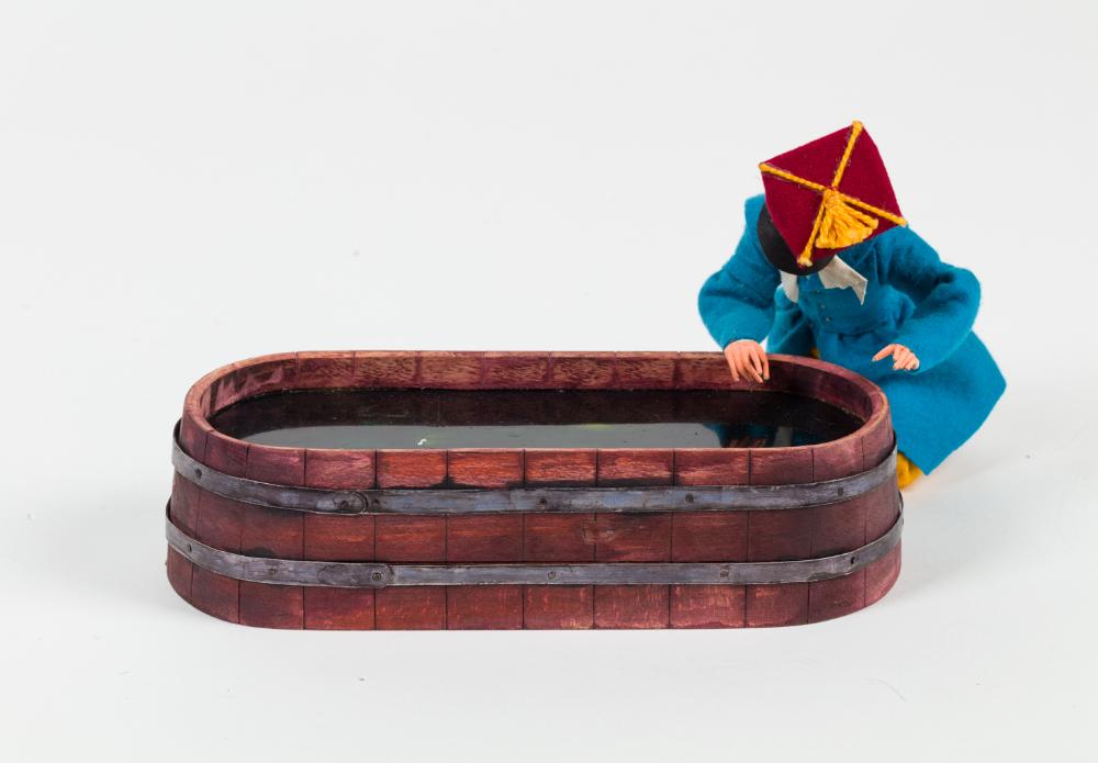 Knabe mit schwarzem Haar, birettförmiger Schiebermütze aus rotem Filz mit schwarzem Dach und gelben Soutachen, weißem Hemd mit weißer Krawatte, türkisblauem Gehrock, gelben Pantalons, weißen Strümpfen und schwarzen Schuhen, vor einem Fischbottich kniend und die Fische beobachtend.