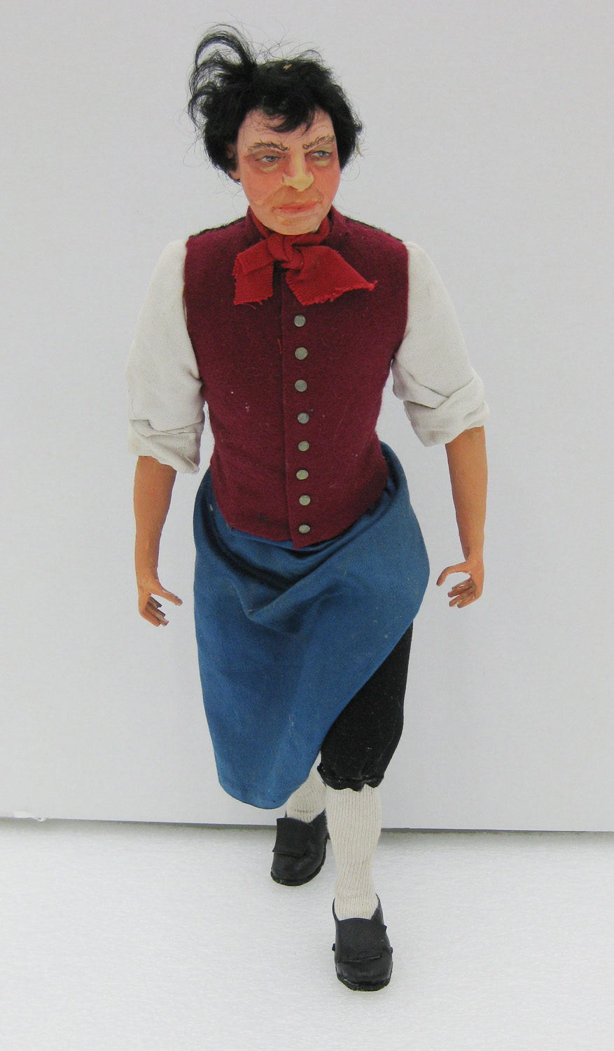 Fischkäufel mit schwarzen Haaren, rotem Gilet mit schwarzem Rücken und goldenen Knöpfen, weißem Hemd, schwarzer Kniebundhose, blauer Schürze, weißen Strümpfen und schwarzen Schuhen, eine Scheibtruhe mit einem Bottich voller Fische schiebend.