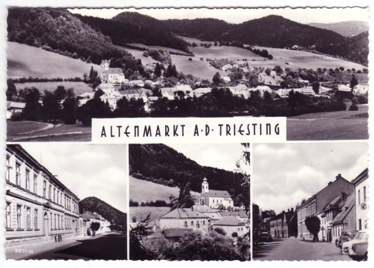 Vier Motive: Panoramaansicht, Straße (2 x), Kirche.