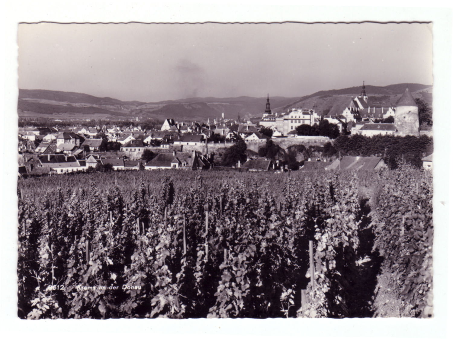 Panoramaansicht, im Bildvordergrund sieht man Weingärten.
