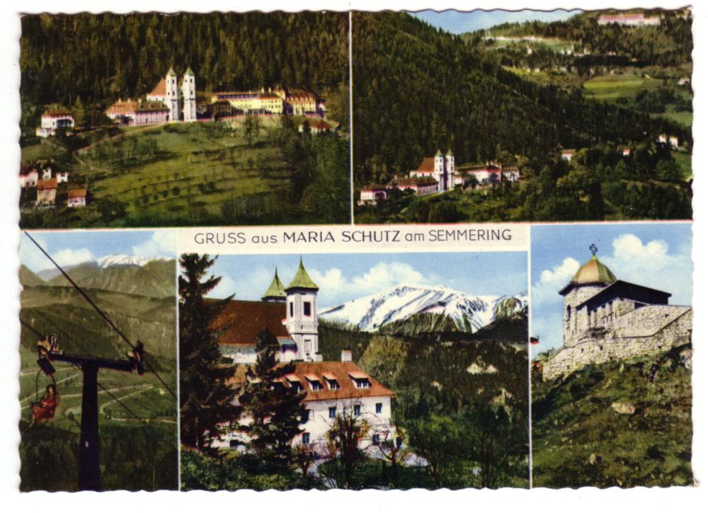 Fünf Motive: Wallfahrtskirche und Kurhotel, Maria Schutz gegen den Semmering, Sessellift auf den Sonnwendstein, Blick gegen den Scheeberg, Gipfelkapelle am Sonnwendstein.