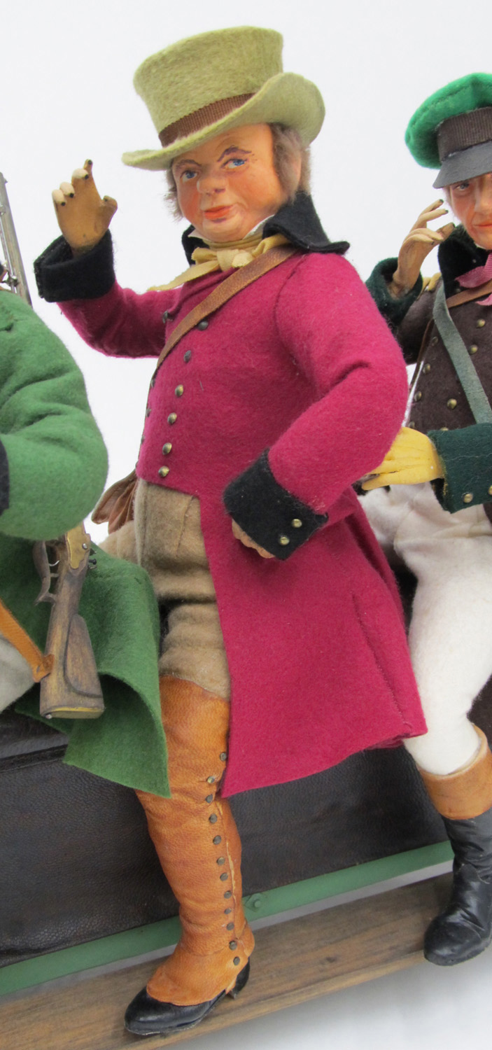 Jäger mit gelbem Zylinder und rotem Jagdfrack; zweite Reihe von vorne.