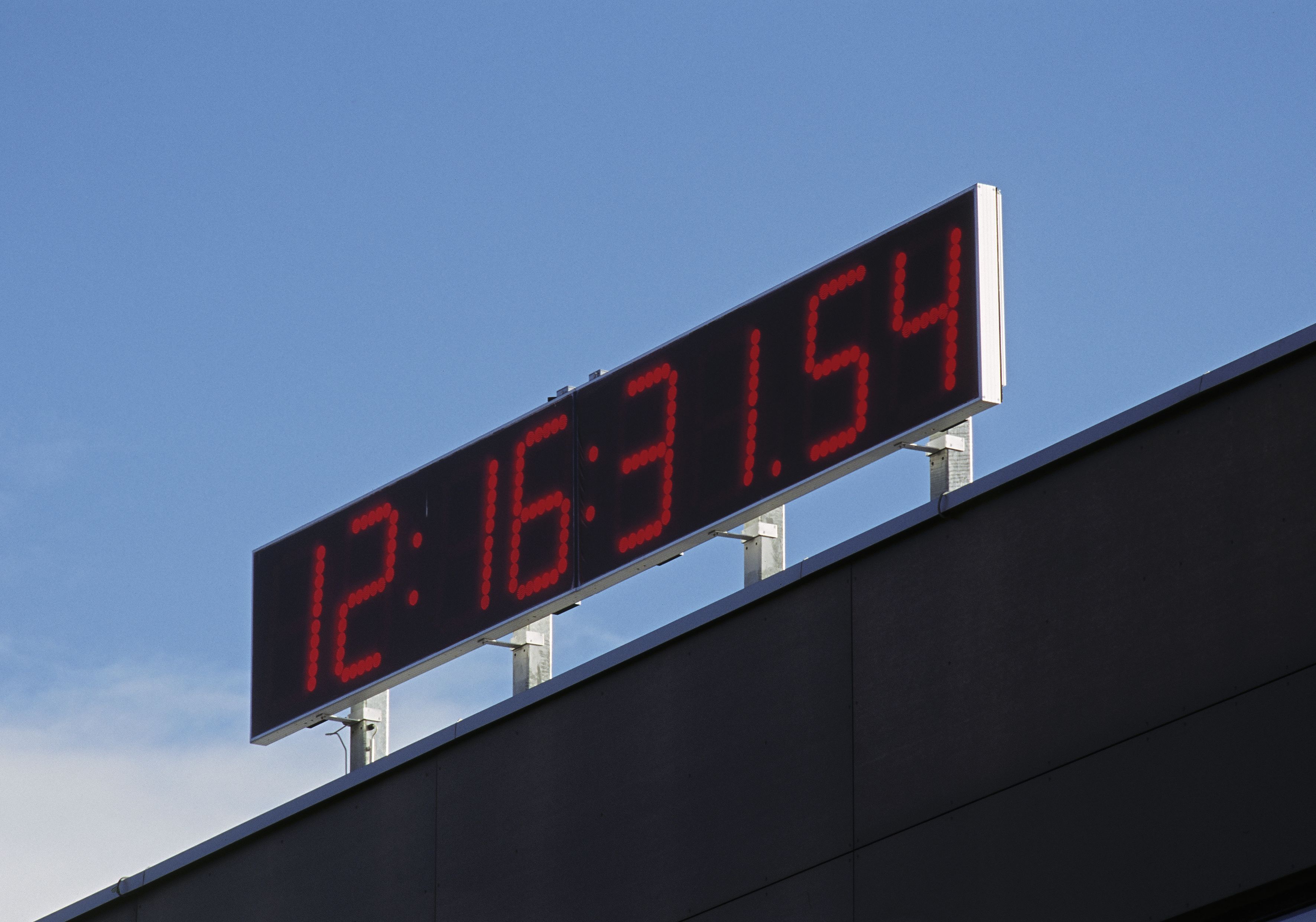 Auf dem Dach des Neubaus der Landesberufsschule Neunkirchen wurde eine sechs Meter lange und einen Meter hohe Schuluhr mit digitaler, achtstelliger Anzeige installiert.