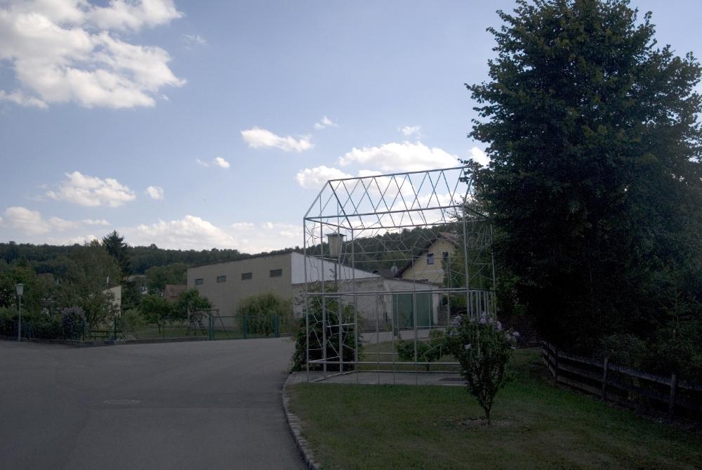 Dieses im oberen Teil des Skulpturengartens installierte Gehäuse paraphrasiert Haus und Garten. Es ist ein Gerüst aus verschieden dimensionierten, verzinkten Stahlrohren, das Pflanzen als Klettergerüst zur Verfügung gestellt wird und so sein Erscheinungsbild mit den Jahreszeiten in Form und Farbe ändert. Die hausförmige Skulptur steht am Anfang da wie eine Architekturzeichnung und mutiert - vielleicht erst nach einigen Jahren - zu einem Labyrinth aus Zweigen und Blättern.