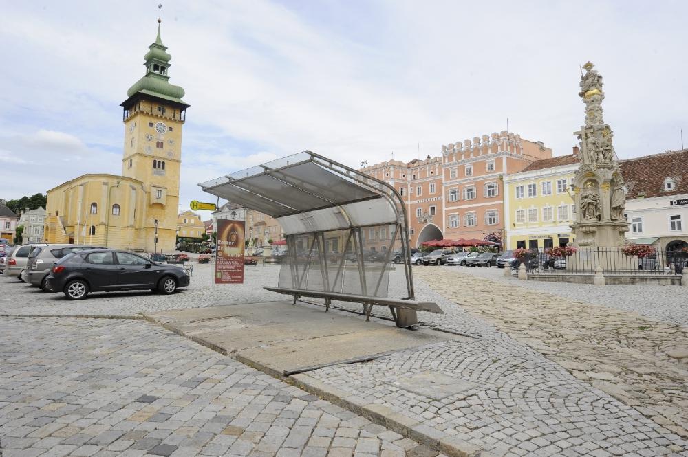 entspricht den jeweiligen örtlichen statischen Beanspruchungen (größerer Abstand zwischen Träger und Flachstahl im Bereich der Krümmung zur Aufnahme des Biegemoments, geringe Gesamtträgerhöhe im Bereich der geraden Enden). Durch das Teilen der Träger im Vertikalbereich und deren v-förmiger Anordnung entsteht ein räumlicher Stützenfuß, wodurch auf eine Einspannung der Träger verzichtet werden kann. Dies vereinfacht einerseits die Fundamentierung und ermöglicht andererseits die Konstruktion eleganter Fußpunkte. In der "Außenschale" (Verglasung) bestehen Rückwand und Dach aus längsseitig gelagertem, klarem Sicherheitsglas mit horizontalen Stoßfugen (ohne Deckprofile) und Niroklemmleisten längs, mit gekrümmten Glaselementen zwischen Rückwand und Dach. Die Seitenverglasung an de (West-)Wetterseite ist "Informationsträger" mit Stadtplan und -chronik; die Scheiben werden mittels Bodenschiene und Einzelpunkthalterung entlang des Dachträgers befestigt. In der "Innenschale" sind lichtdurchlässige Nironetze (aus Drähten stoffähnlich verwoben) als vorkonfektionierte Elemente in die Konstruktion gespannt und bilden so eine zweite Schicht, die der Glasabsturzsicherung und als Sonnenschutz an der Decke dient (Himmel) und die Wartebank und deren Rückwand herstellt.