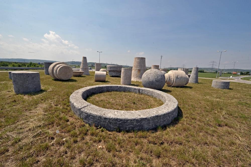 Material verfremdet wurden. Die Positionierung auf dem Kreisverkehr erinnert an historische