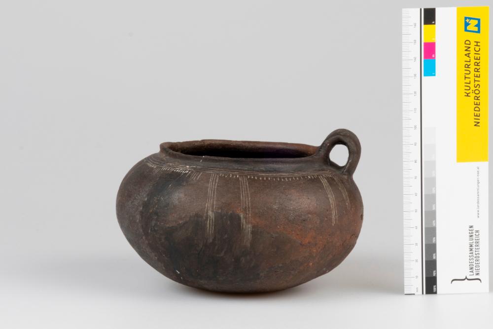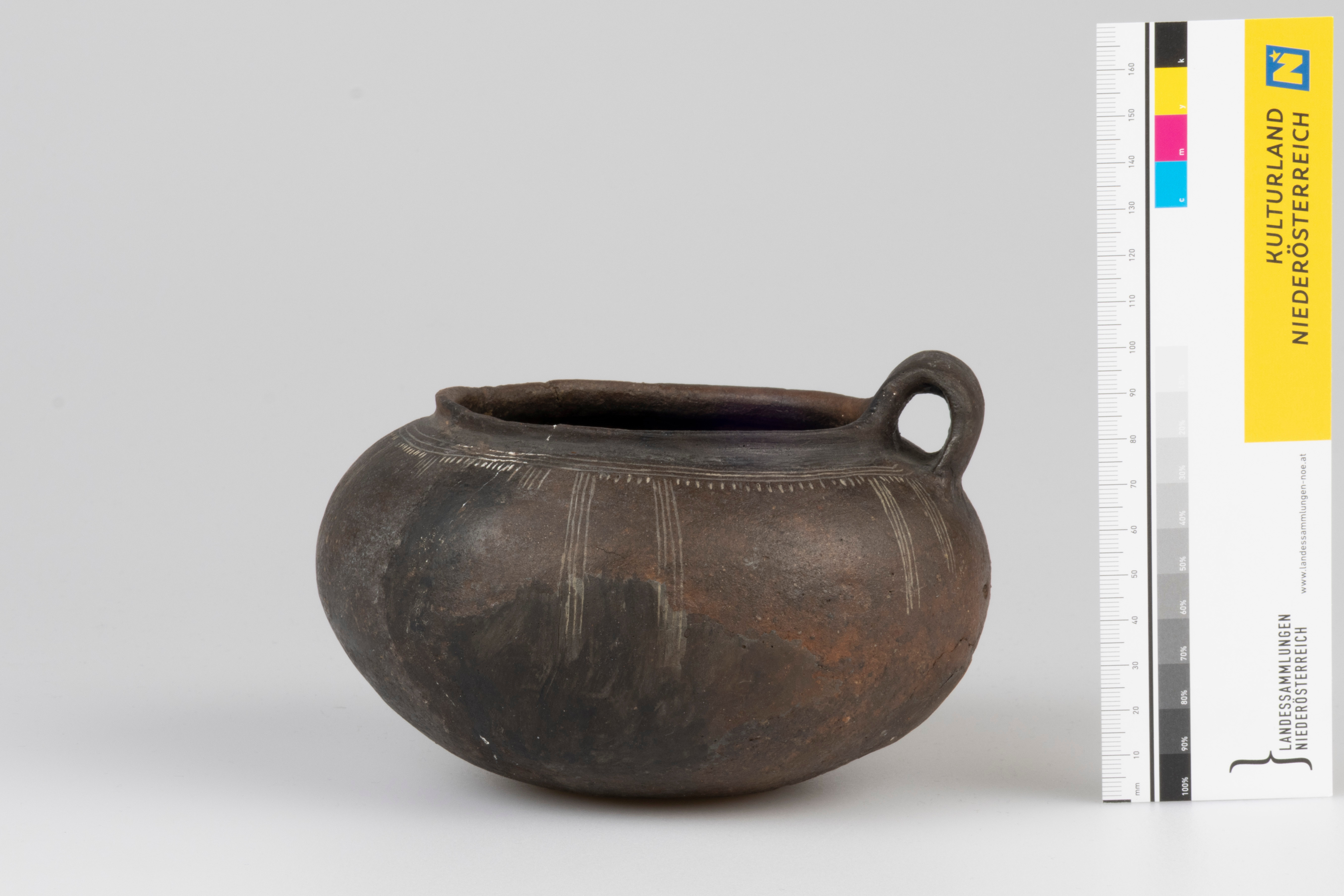 Eine Schale mit einem breiten Henkel, der leicht über den Rand hinausragt. Der Mundsaum ist leicht ausgebogen. Die Schulterpartie weist eine inkrustierte Verzierung auf, die aus je drei parallel verlaufenden Linien besteht. Unterhalb davon sind durchgehend kurze vertikale Einkerbungen sowie Linienbündel angesetzt, mit einer Länge von teils ca. 0,5 cm, teils ca. 3-4 cm. Unter dem Henkel und auf der Vorderseite der Schale bilden sechs Linien ein nach unten gerichtetes Y. Die Außenseite des Gefäßes weist eine polierte, dunkelbraune bis braune Oberfläche auf.