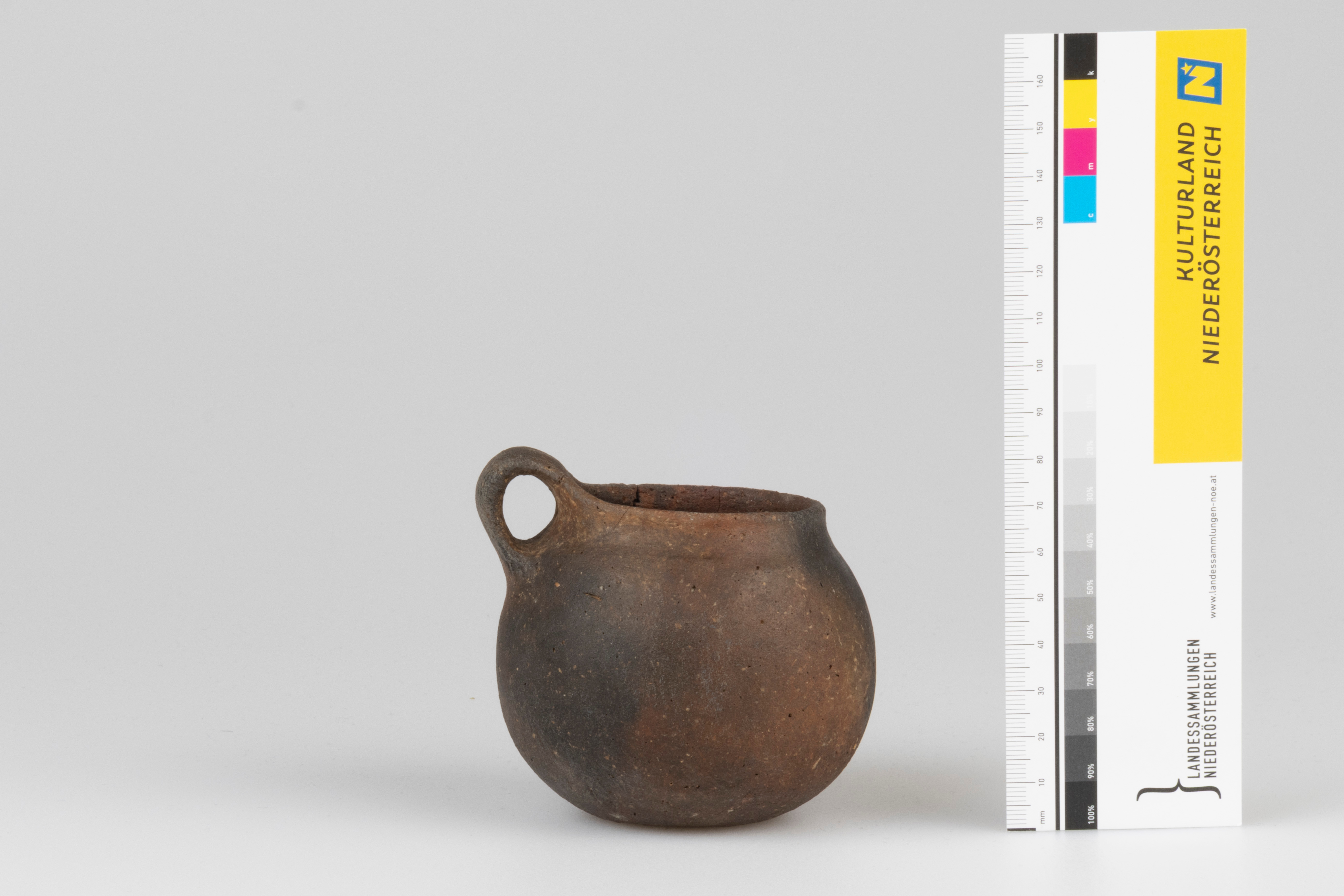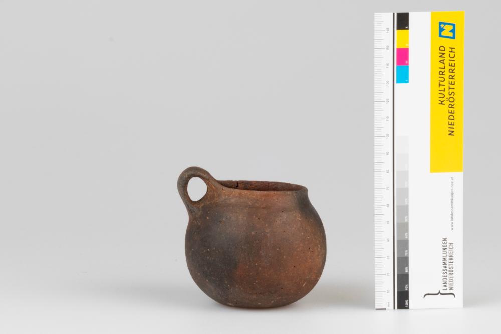 Eine bauchige kleine Tasse mit breiten Bandhenkel, der über den nach oben gezogenen Rand hinausragt. Die Schulterpartie ist leicht abgesetzt. Die Außenseite des Gefäßes weist eine polierte, dunkelbraune bis braune Oberfläche auf.
