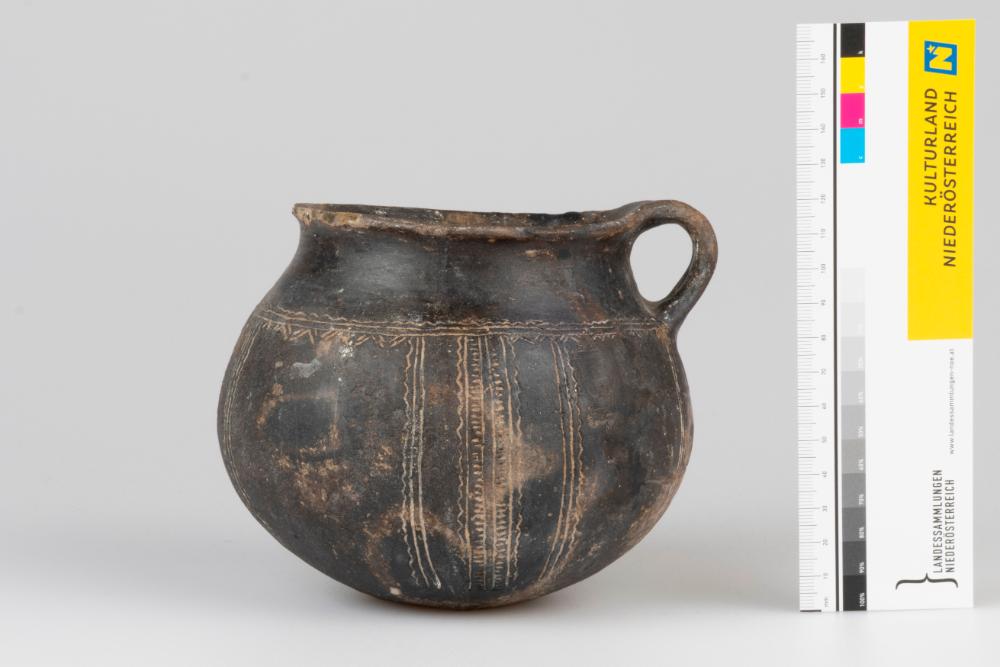 Die Henkelschüssel ist durch einen schwach ausladenden Mundsaum gekennzeichnet, wobei der bandförmige Henkel leicht emporgezogen ist. Der Bauch ist mit inkrustierten Verzierungen versehen. Das Gefäß wurde partiell ergänzt.