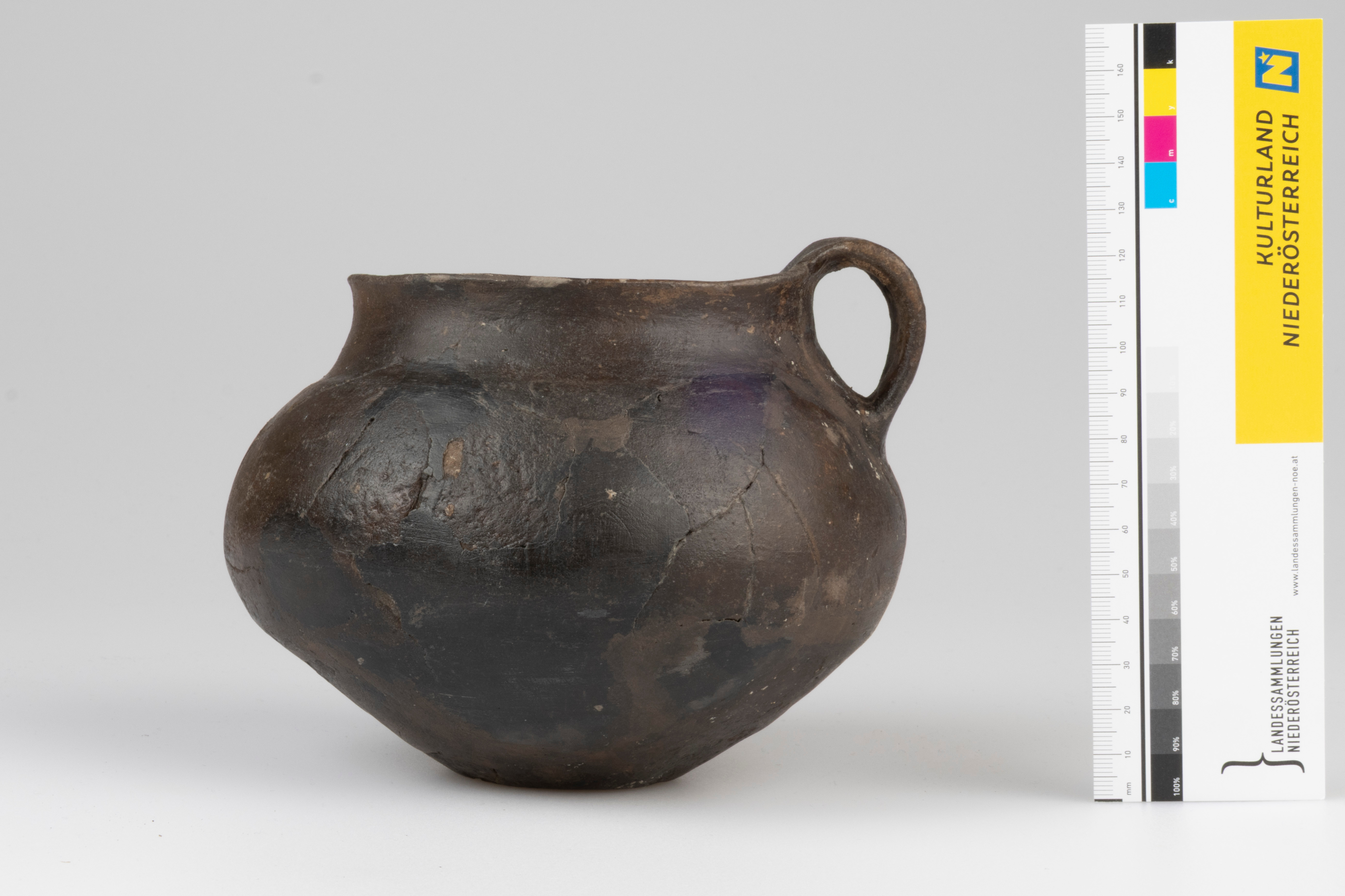 Unverzierte, bauchige Schüssel mit breiten Bandhenkel, der leicht über den Rand hinausragt. Die Schulterpartie ist abgesetzt. Die Außenseite des Gefäßes weist eine polierte braune Oberfläche auf.