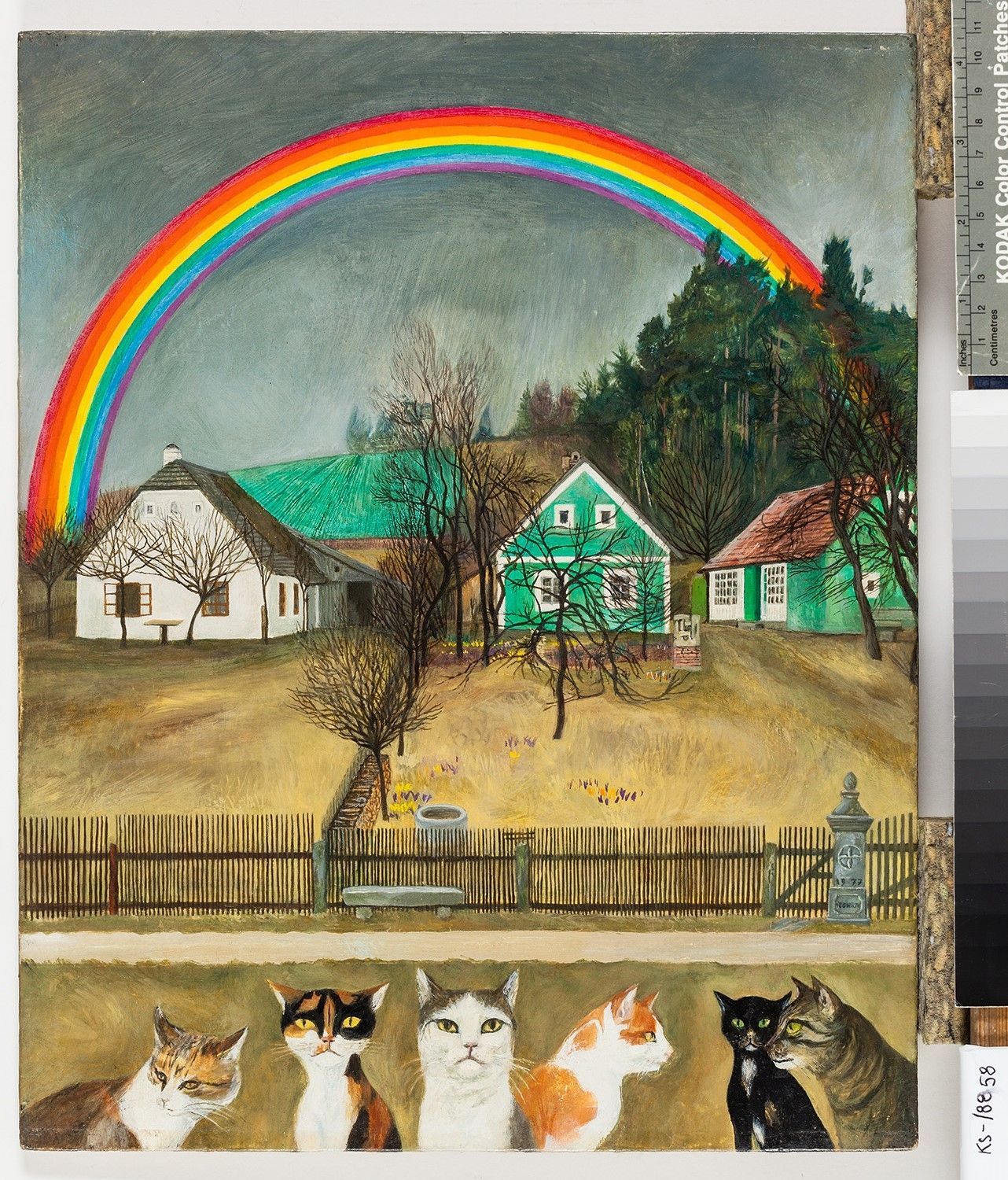 SignaturRS sign., bet., dat.: "ARNULF NEUWIRTH / Katzen unter einem Regenbogen / Öl auf Novopan / 1975-78"