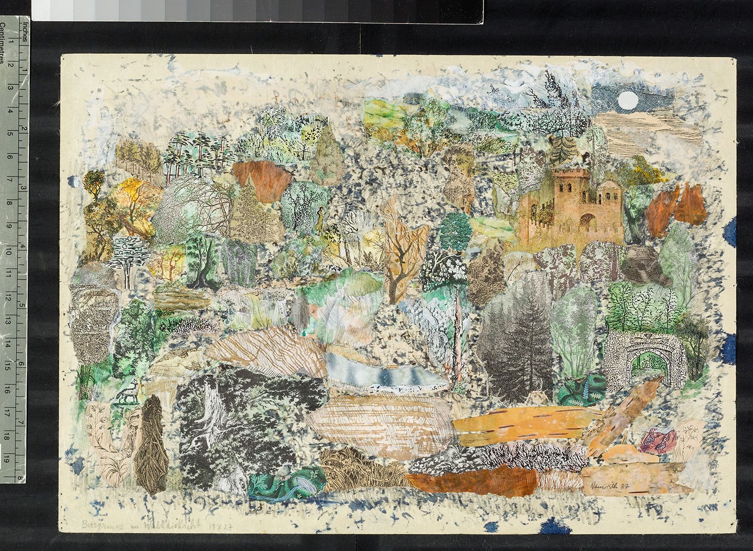 Signaturli unten bet.:" Ruine im Wlddickicht" re. u. sign. und dat. " Neuwirth 87" und rs. bez.: "Arnulf Neuwirth / Burgruine in einem Walddickicht / Collage 1987"