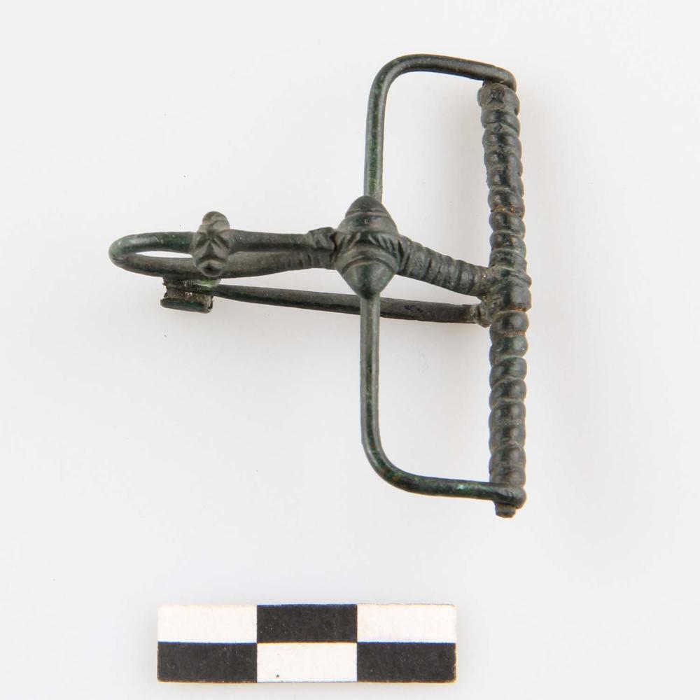 Die bronzene, ostalpine Tierkopffibel besitzt eine Armbrustkonstruktion sowie einen zurückblickenden, stark stilisierten Fußtierkopf. Der umgeschlagene Fuß hat einen angesetzten Nadelrast, auf dem sich ein stark schematisierter Vogelkopf befindet. Die Feder ist am Bügel befestigt, der winklig gebogen ist und einen annähernd dachförmigen Querschnitt sowie Kerbenverzierungen aufweist. Am Scheitelpunkt befindet sich ebenfalls ein stark stilisierter Vogelkopf. Die breite, eingliedrige Armbrustkonstruktion verfügt über einen quer durch die Spiralrollen gesteckten Eisenstift und eine Nadel.