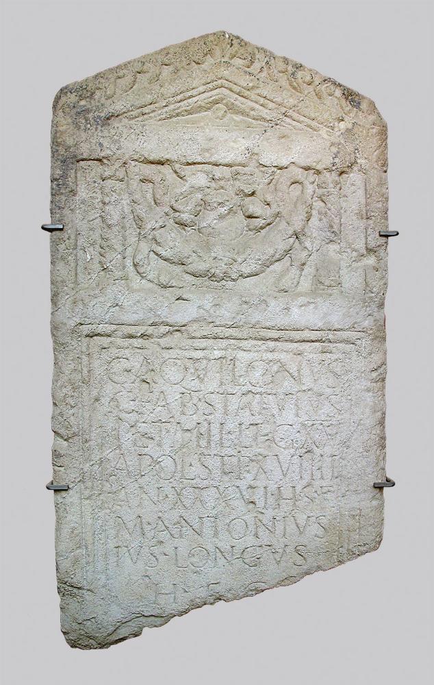 C(aius) Aquilonius / C(ai filius) Fab(ia) Statutus / Pet(avio) mil(es) leg(ionis) XV / Apol(linaris) sti(pendiorum) XVIIII / an(norum) XXXVI h(ic) si(tus) e(st) / M(arcus) Antonius / Longus / h(eres) f(aciendum) c(uravit)