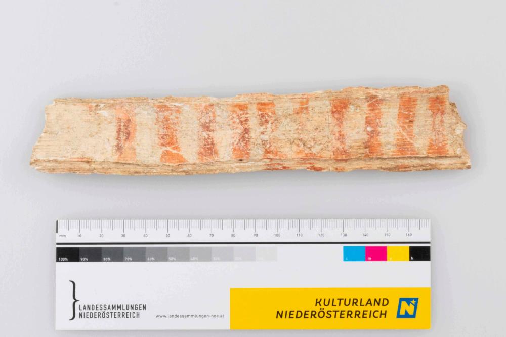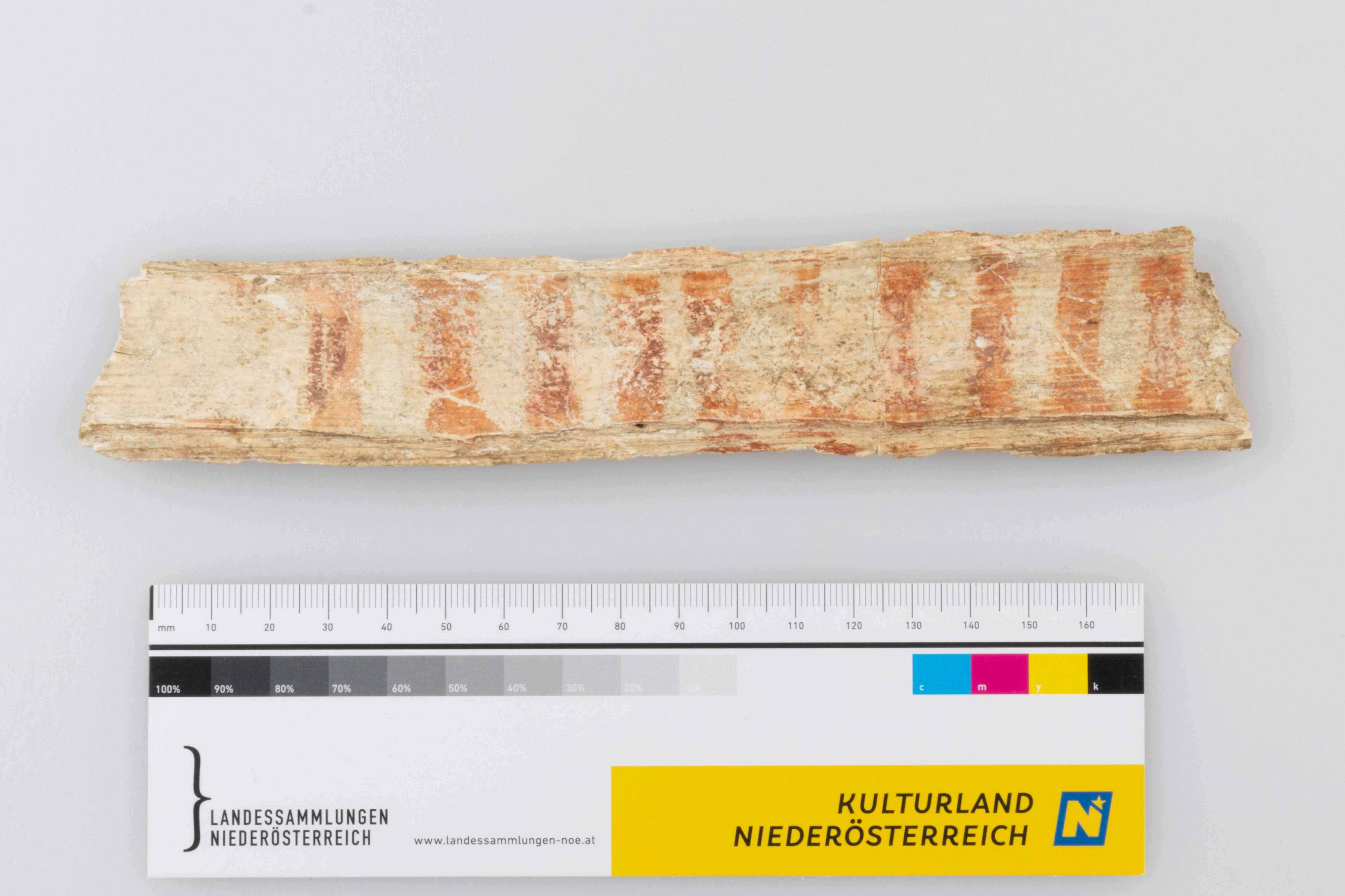 Die aus Elfenbein gefertigte Lamelle weist auf beiden Seiten der Länge nach Brüche auf und zeigt an den Rändern leichte Absplitterungen. Auf der konkaven Innenseite sind zehn querlaufende rote Streifen erkennbar, die sich bis zu den seitlichen Bruchflächen erstrecken. Dies deutet darauf hin, dass das Artefakt in der Breite vollständig ist. Angesichts der Bruchstellen an den Längsenden lassen sich jedoch weder die ursprüngliche Länge noch der Verwendungszweck mit Sicherheit bestimmen.