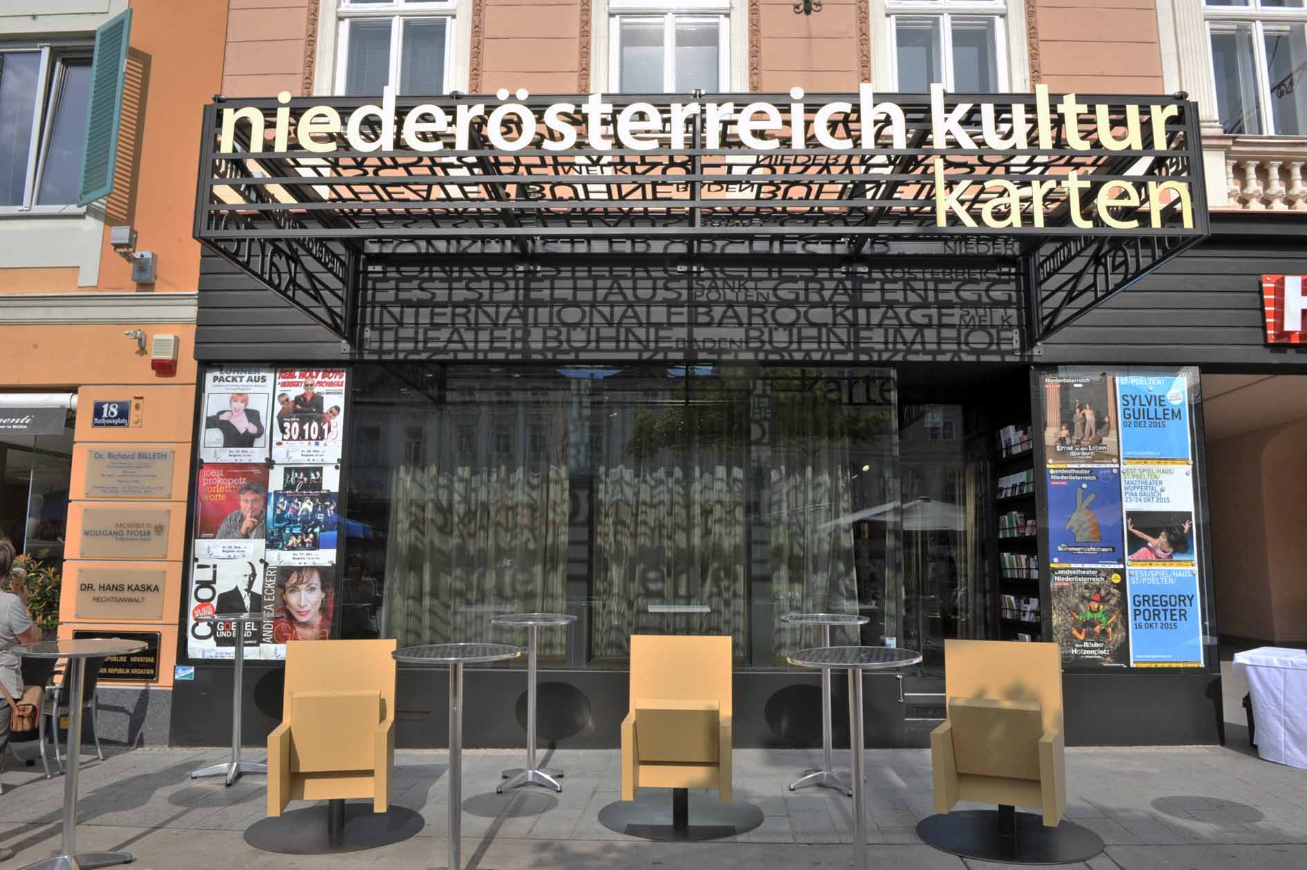 und dem Landestheater Niederösterreich erhält das Kartenbüro der Niederösterreichischen Kulturwirtschaft am Rathausplatz St. Pölten ein neues Gesicht. Für die künstlerische Umgestaltung verantwortlich zeichnet sich feld72, Kollektiv für "Architektur und urbane Strategien".