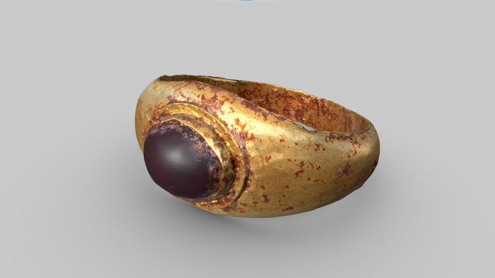 Dünner, im Querschnitt ovaler Reif, der sich zur Vorderseite hin verbreitert. In der Ringplatte ist eine ovale rote Glaspaste eingesetzt.