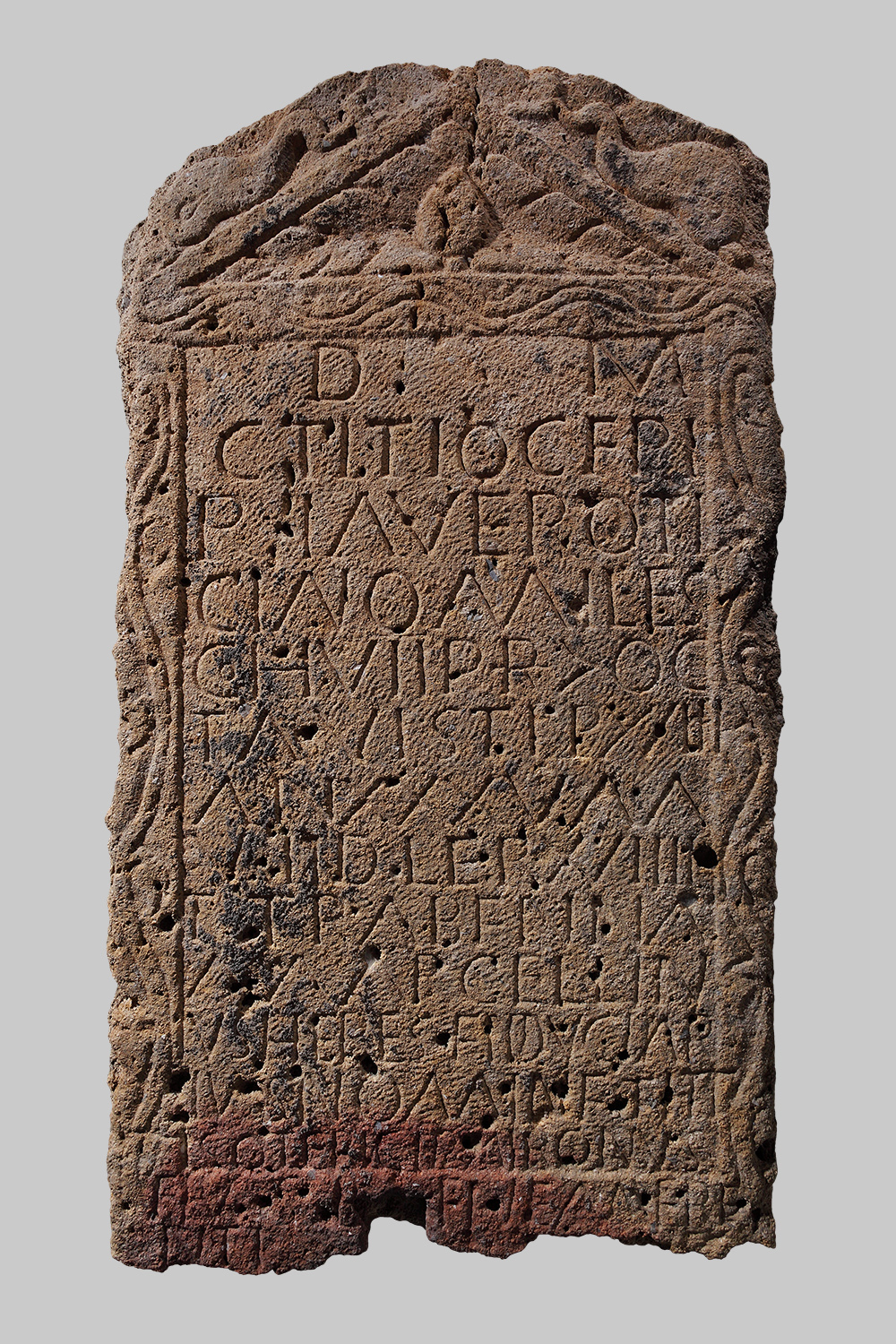 »Den Manen. Dem Gaius Titius Verus, Sohn des Gaius, zur Tribus Papiria (gehörend), aus Ticinum, Soldat der siebenten prätorianischen Kohorte, aus der Zenturie des Octavus, 18 Dienstjahre, 35 Jahre, 7 Monate und 19 Tage alt, (hat) Titus Trabenna Marcellinus, Treuhanderbe, im Namen des Titius Sotericus dem Herrn, dem Wohlverdienten, (diese Stele gesetzt).«