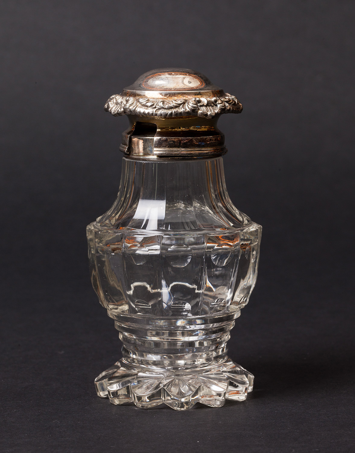 Flakonförmiger Korpus mit reicher Profilierung. Standfläche in Blütenform geschliffen. Gerade Faltenzüge entlang der Wandung, teils durch horizontale Profile unterbrochen. Montierung aus Silber mit Scharnierverschluss, Aussparung für den Senflöffel und angesetztem floralem Ornamentring.