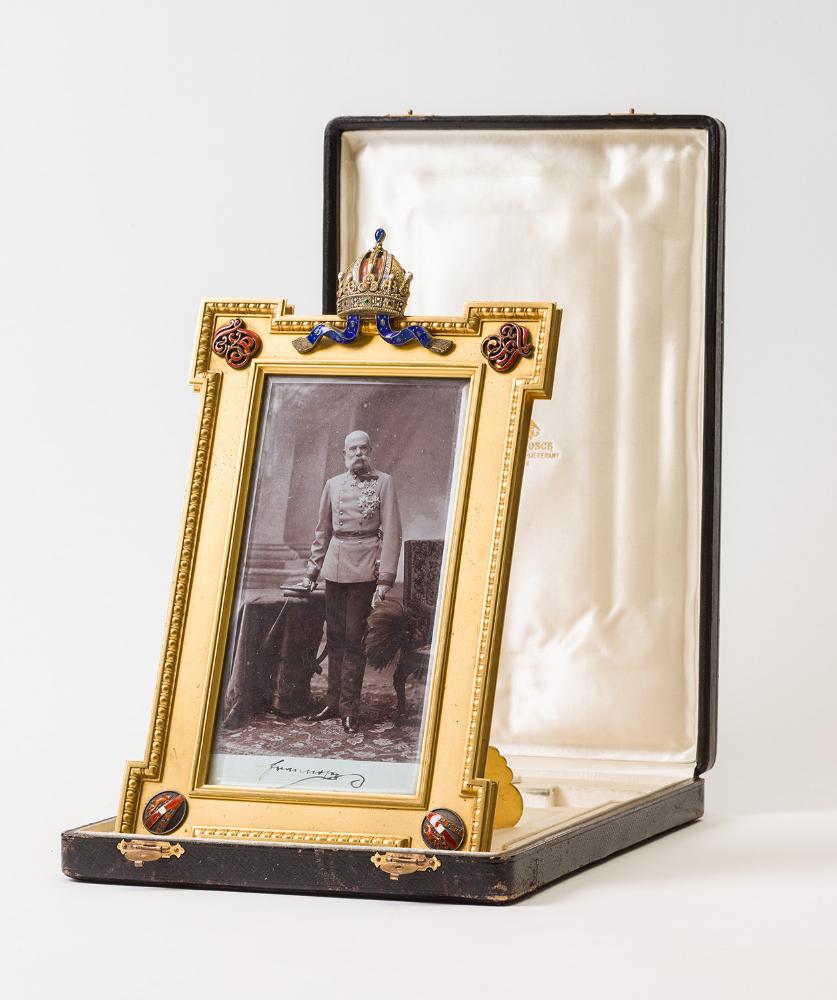 Prunkrahmen mit umlaufendem Eierstab und gekröpften Ecken aus vergoldeter Bronze. In den unteren Zwickeln aufgesetzt ovale Wappenschilder des Hauses Habsburg-Lothringen aus Silber, transluzid Rot und opak Weiß emailliert. In den oberen Zwickeln aufgesetzt das Monogramm "FJ" aus Silber, guillochiert und transluzid Rot emailliert. Mittig oben aufgesetzt rudolphinische Hauskrone aus Silber, vergoldet, polychrom transluzid und opak emailliert. Facettierte Glasscheibe. Reich durchbrochener Steller mit Scharnier rückseitig. Originale Schatulle mit schwarzem Ziegenleder bezogen und innen mit weißem Atlas ausgeschlagen.
