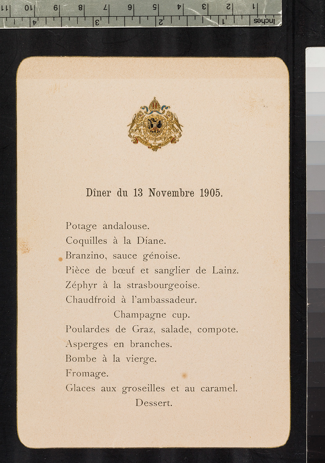 Speisekarte für ein Diner der Hof- oder Galatafel vom 13. November 1905, mit farbig geprägtem kaiserlichen Wappen