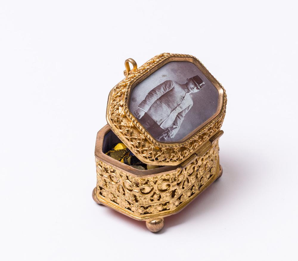 Kaiserlicher Hof - Hoftafelbonbonniere. Dose mit einer Photographie von Erzherzog Karl (des späteren Kaiser Karl I. als jungen Erzherzog), innenliegend Wachs- und Papierblumen mit Seidenband