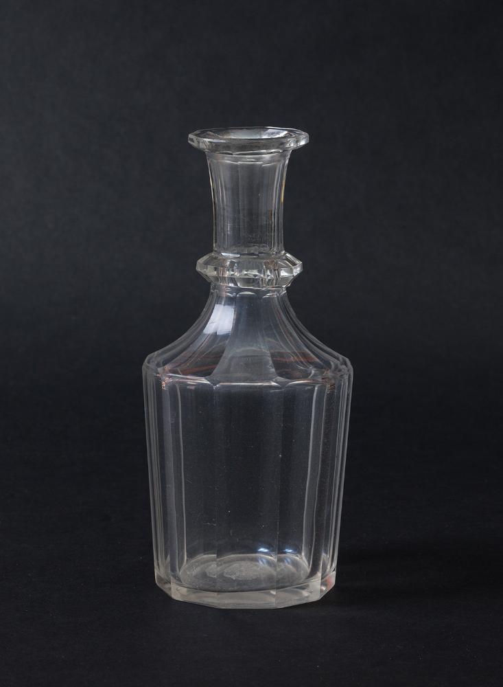 Karaffe aus der Villa Wartholz. Runde Karaffe mit konischer Wandung, Steilschulter, Nodus am Hals und Facettenschliff.