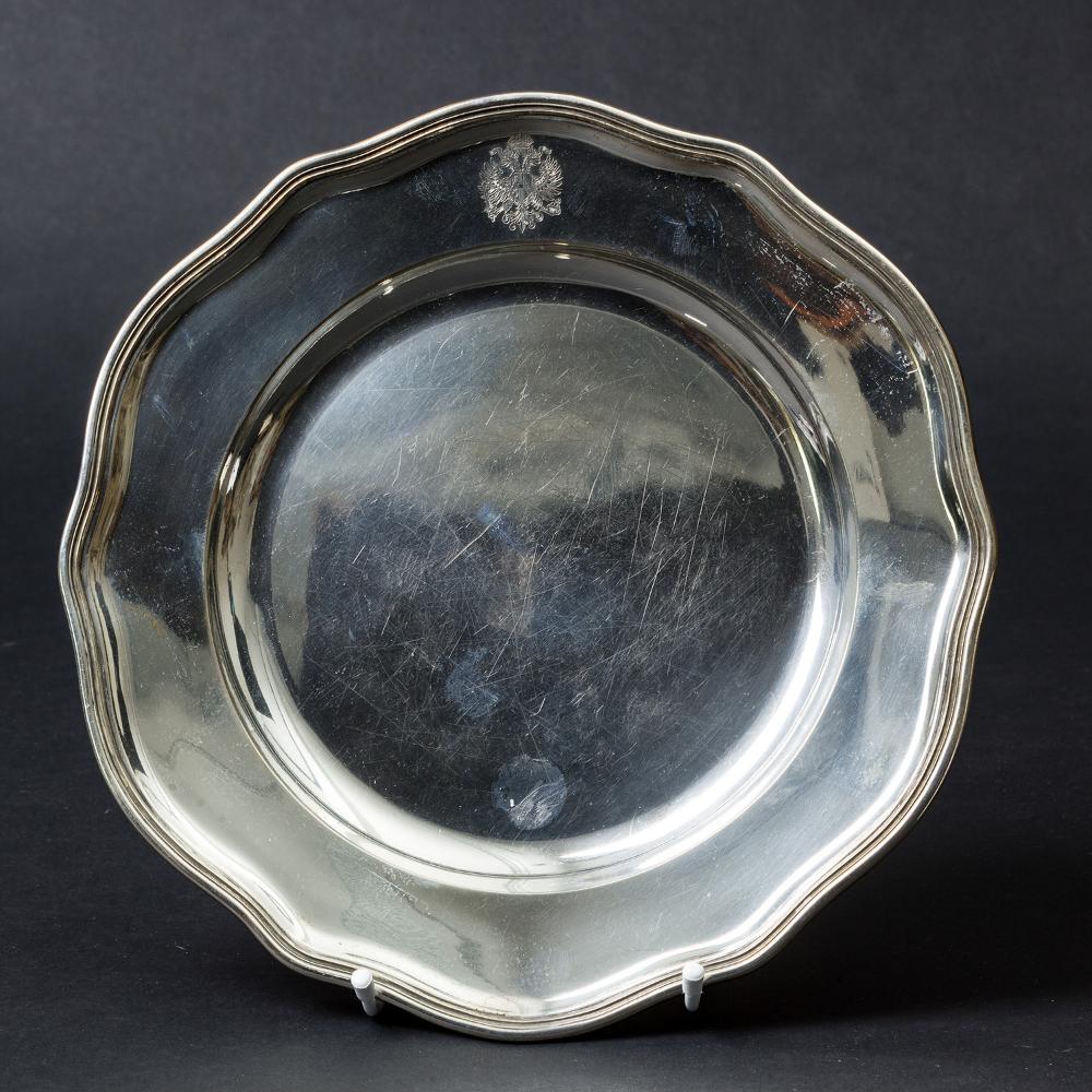 Österreichischer Hof - Teller aus einem kaiserlichen Tafelservice. Silber, rund fassoniert, Fahne mit kaiserlichem Doppeladler, Meisterzeichen J.C. K. = J. C. Klinkosch, Wiener Dianakopfpunze 1872-1922