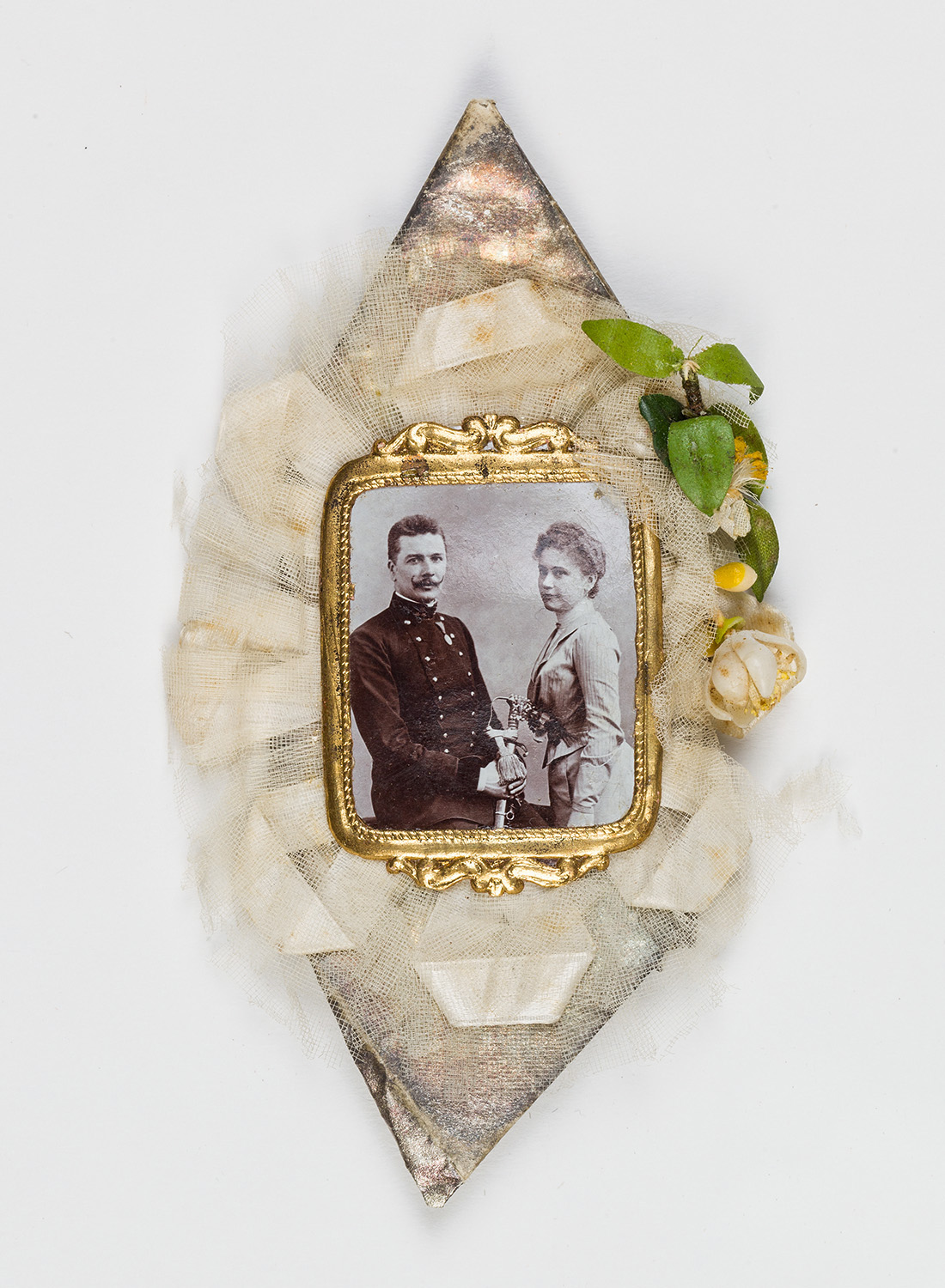 Kaiserlicher Hof - Hofballzuckerl mit der Photographie eines Paares und mit einem kleinen Wachsblumengesteck (Zuckerl nicht erhalten)
