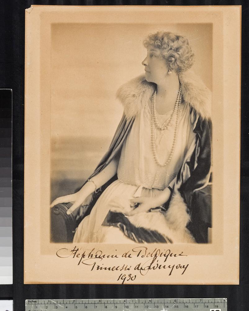 Geschenkfoto mit eigenhändiger Widmung "Stephanie de Belgique Princesse de Lonyay 1930", gerahmt mit Aufsteller