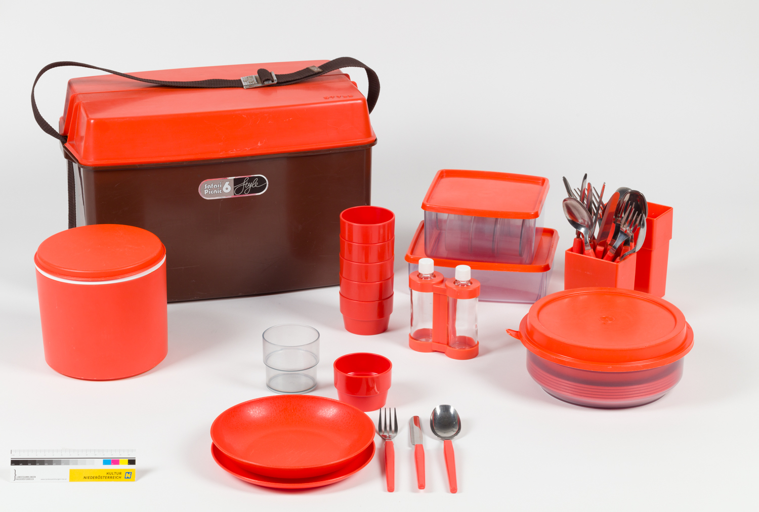 Picknick-Set in Kunststoffkoffer mit Trageriemen, bestehend aus: 1 isolierter Essensbehälter; 1 Kunststoffbox; 2 Glasflaschen (für Essig/Öl) in Kunststoffträger; 6 Stk. Trinkgefäße (Heißgetränke); je 6 Stk. in Kunststoffboxen: Teller flach, Teller tief, Messer/Gabel/Löffel, Trinkgefäße (Kaltgetränke)