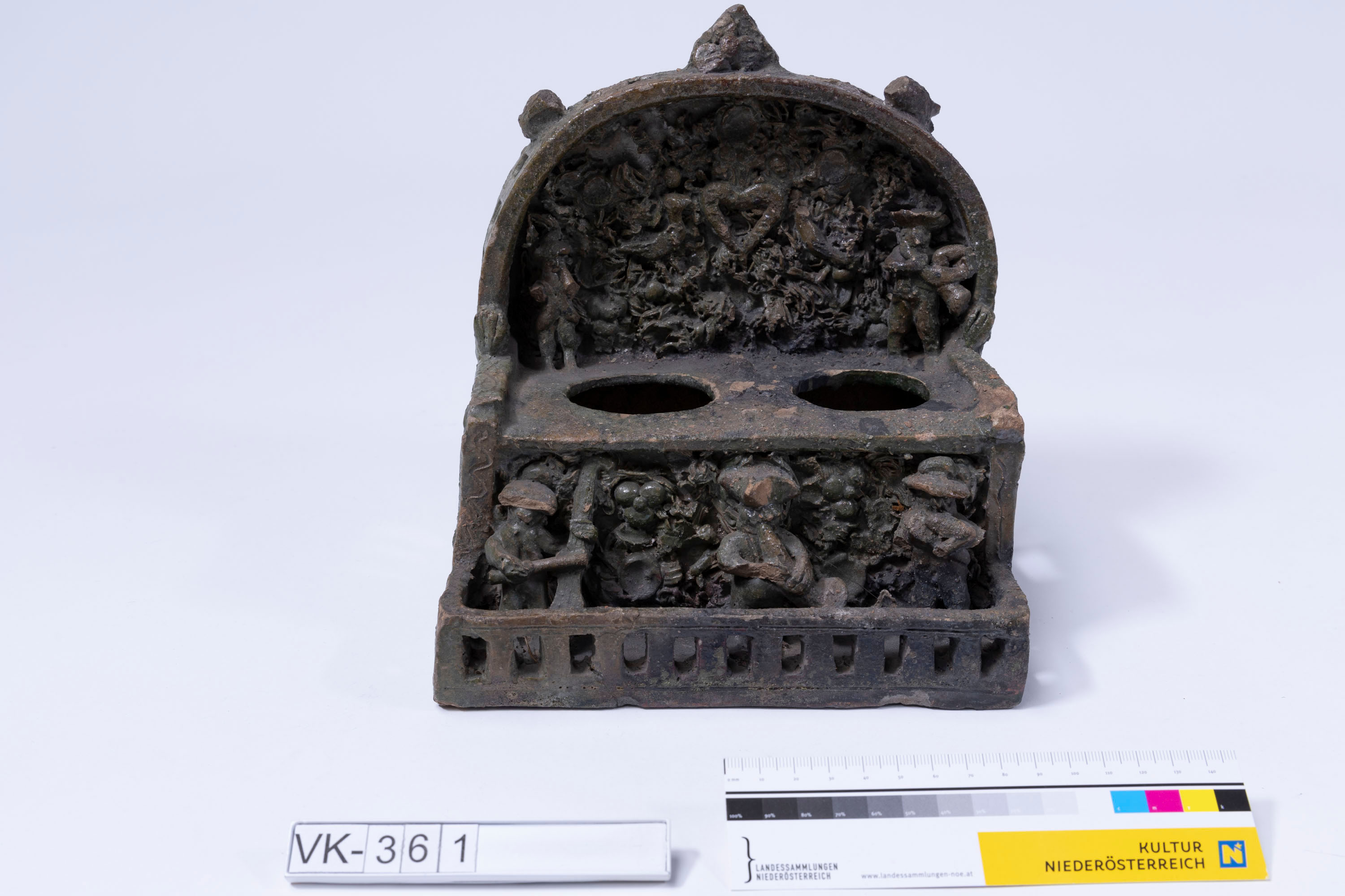 Titenzeug (Halter für zwei Tintenfässer) aus Keramik mit halbrunder Rückwand, vergitterten Seitenteilen und Reliefverzierungen: Pflanzen, Tiere, Volksmusikanten.