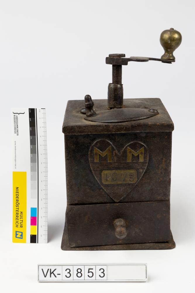 Kaffeemühle mit quadratischer Grundfläche, einer Kurbel mit Messingknauf und einer Schublade. An der Vorderseite befindet sich ein Blechschild mit den Buchstaben "MM" und der Datierung 1873.
